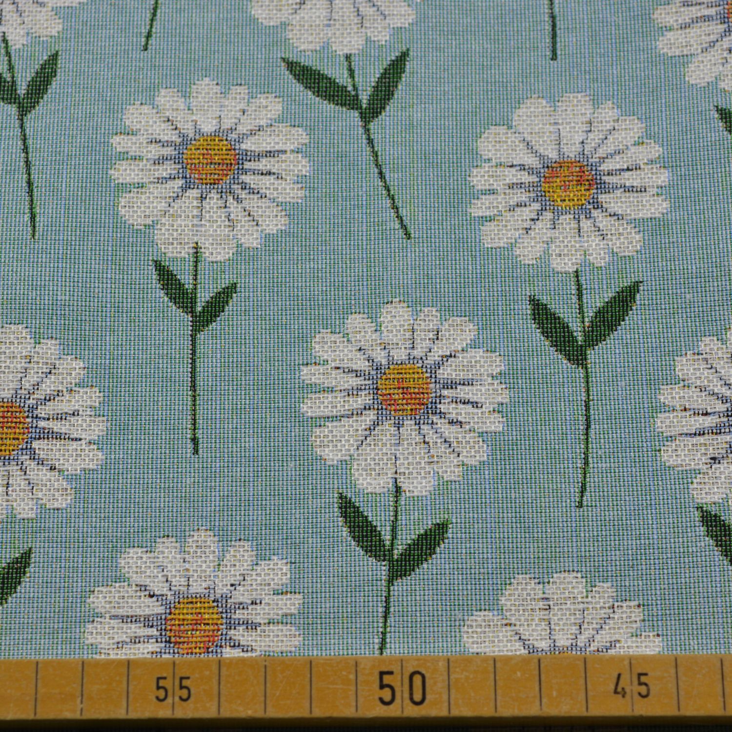 Dieser hochwertige Gobelin überzeugt mit einem frischen Margeritenmuster auf einem zarten hellblauen Hintergrund. Die weißen Blüten mit gelber Mitte und grünen Stielen wirken freundlich, leicht und sommerlich – perfekt für eine frische Wohnatmosphäre.