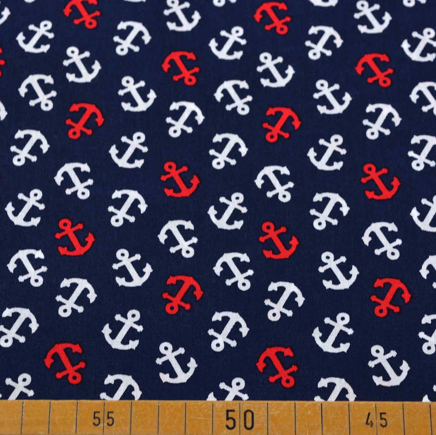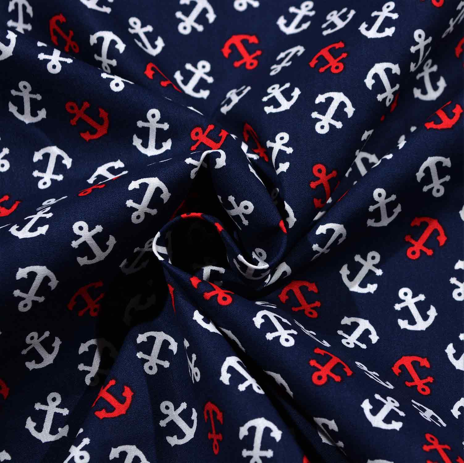 Unser hochwertiger Baumwollstoff ist perfekt für maritime und stilvolle Nähprojekte geeignet. Er besteht zu 100% aus Baumwolle, was ihm eine weiche Haptik und natürliche Atmungsaktivität verleiht. Mit einer Breite von 148 cm und einem Gewicht von 130 g/m² ist er leicht und dennoch strapazierfähig genug für eine Vielzahl von Anwendungen wie Kleidung, Accessoires und Heimtextilien. Das Design zeigt rote und weiße Anker auf einem klassischen marineblauen Hintergrund, was jedem Projekt eine maritime und frische Note verleiht. Dieser Stoff eignet sich besonders gut für maritime Dekorationen, Bekleidung und Accessoires.