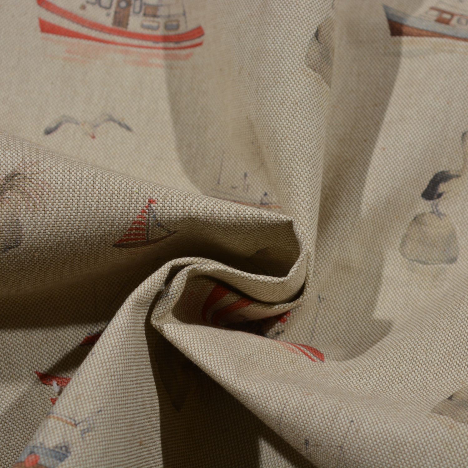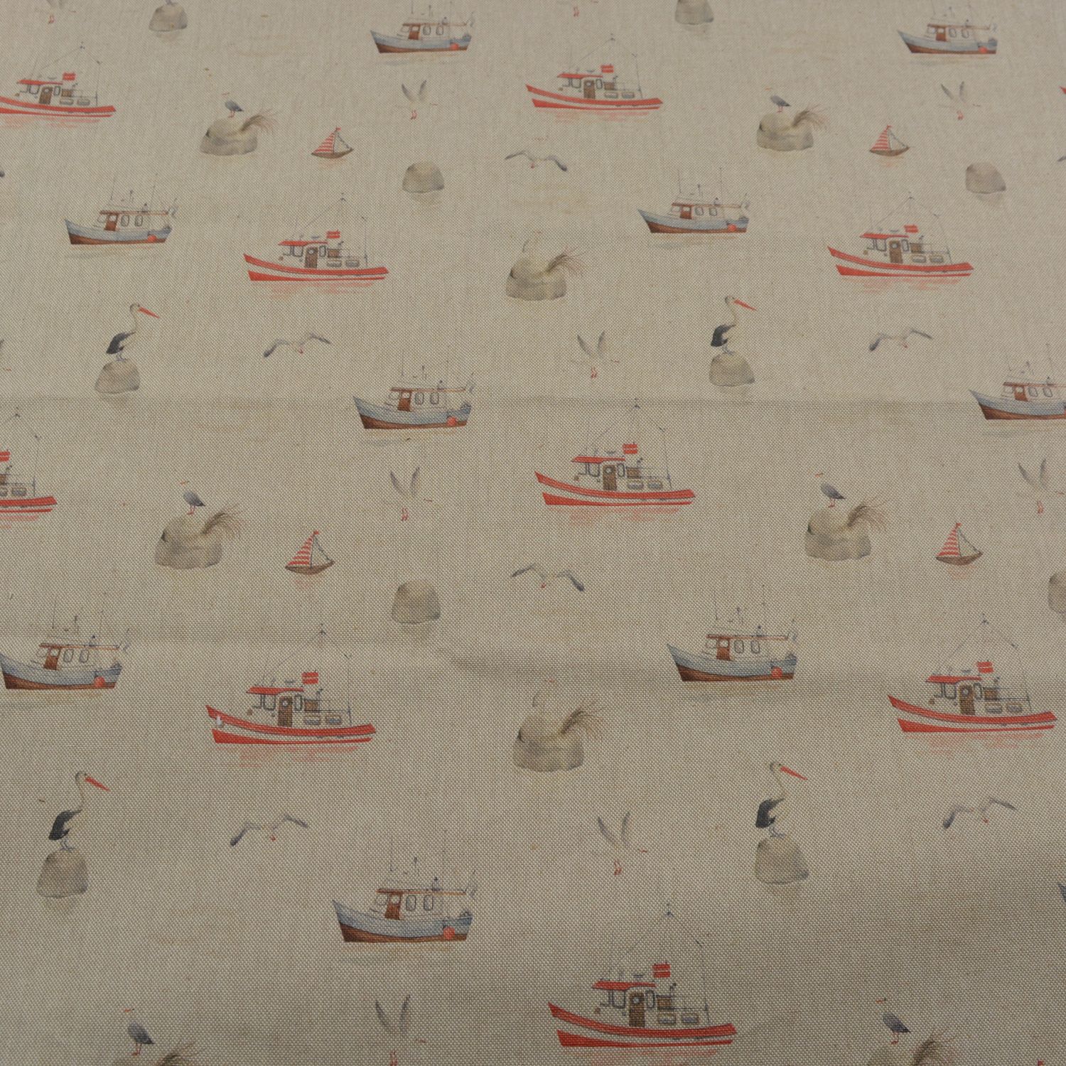 Dieser dekorative Stoff bringt sofort maritimes Flair in jeden Raum. Auf einem naturfarbenen Hintergrund in Leinenoptik verteilen sich liebevoll gestaltete Motive wie kleine Fischerboote, Segelboote, Möwen und Küstenfelsen. Die Kombination aus sanften Beige-, Grau- und dezenten Rot- sowie Blautönen wirkt ruhig, harmonisch und typisch nordisch.