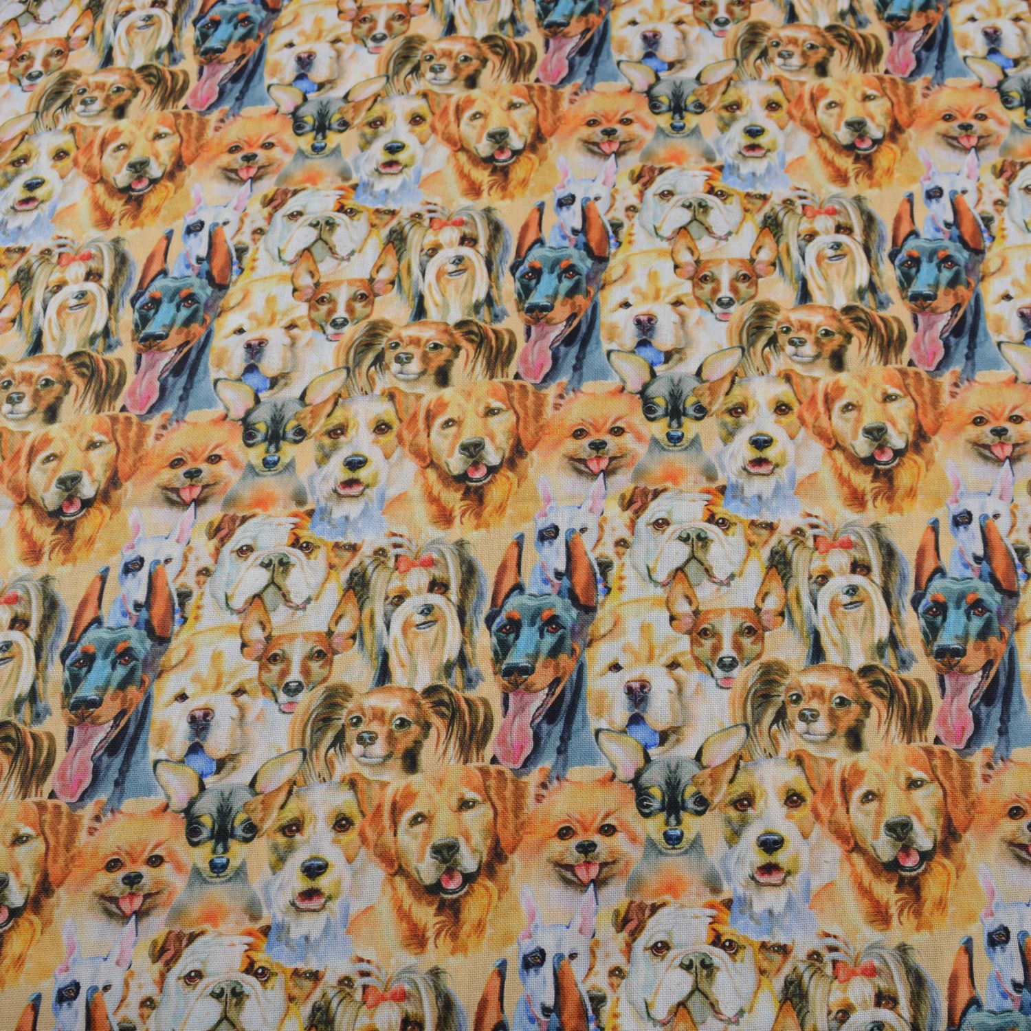 Dieser ausdrucksstarke Dekostoff überzeugt mit einer detailreichen Collage aus realistisch dargestellten Hundeportraits verschiedenster Rassen. Die liebevoll gestalteten Gesichter – vom Golden Retriever über Chihuahua bis hin zum Dobermann – sorgen für eine lebendige und emotionale Optik.
