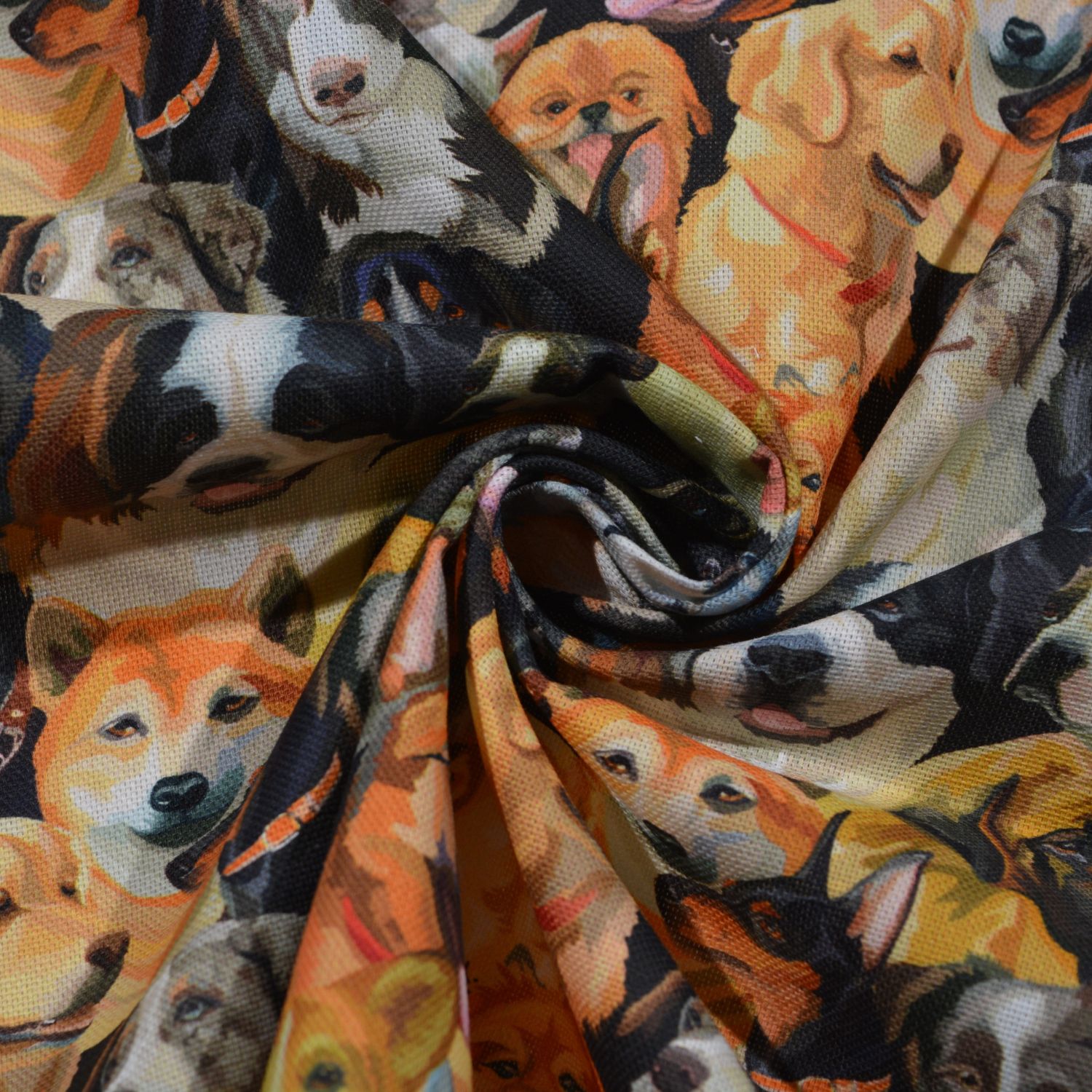 Dekostoff „Rocco“ – Hunderassen Collage auf Schwarz