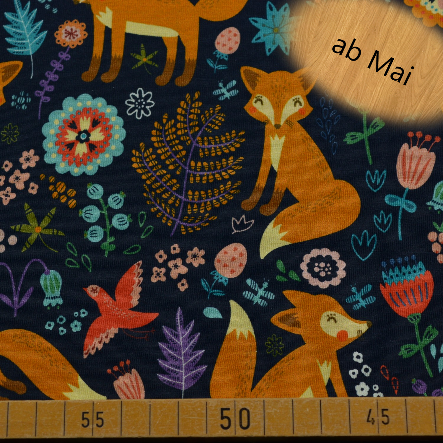 Dieser wunderschöne Baumwoll-Jersey begeistert mit seinem detailreichen Design aus verspielten Füchsen, Blumen und Waldmotiven auf dunklem Hintergrund. Die Kombination aus warmen Erdtönen und lebendigen Farben macht diesen Stoff zu einem echten Hingucker für kreative Nähprojekte. Dank der weichen, elastischen Qualität eignet er sich perfekt für bequeme Kleidung wie Shirts, Kleider, Leggings oder Kinderbekleidung.
