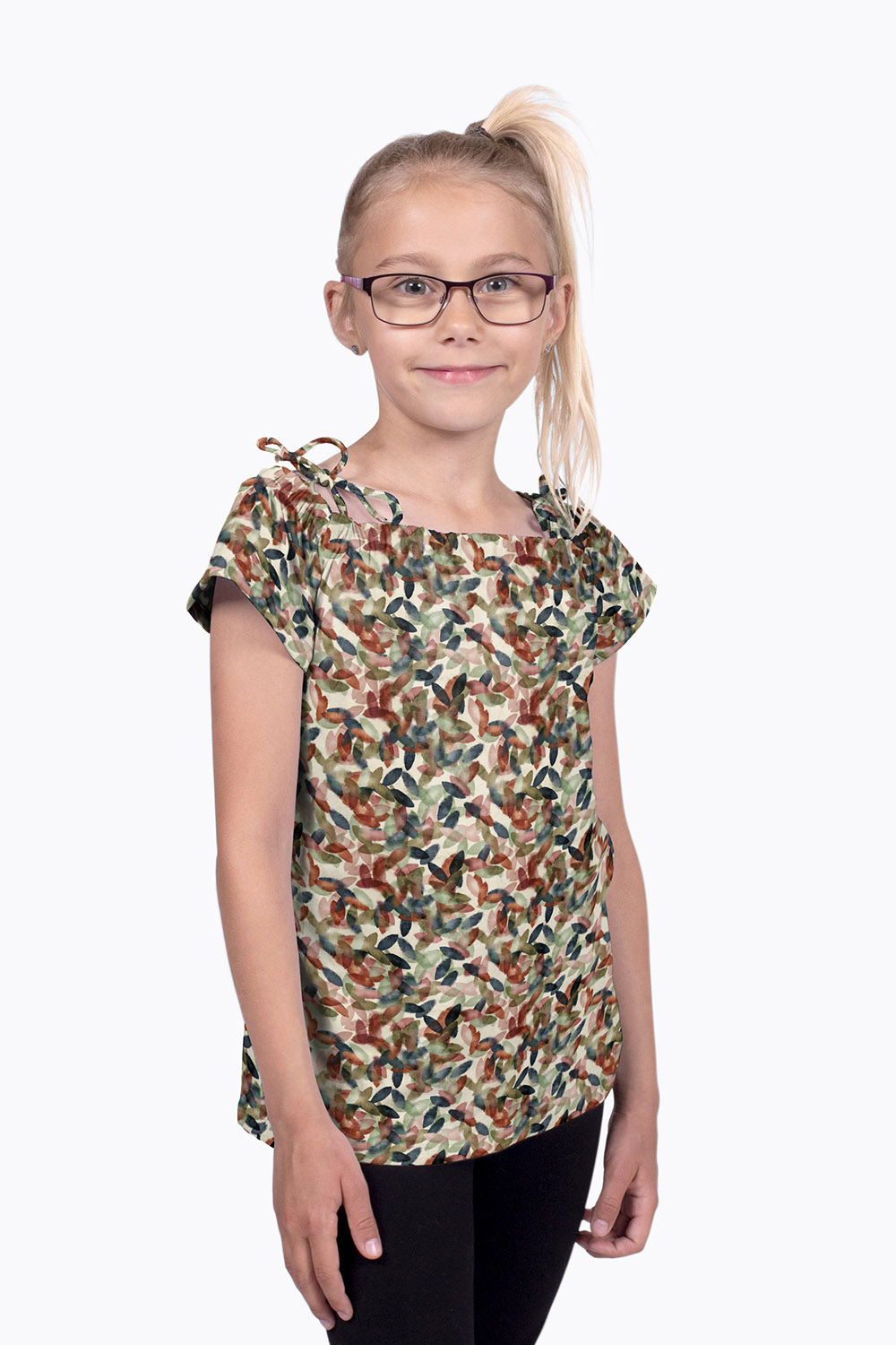 Die Oberfläche ist beige und mit einem Gewirr einzelner Blätter in grün, braun, altrosa und schwarz bedruckt.