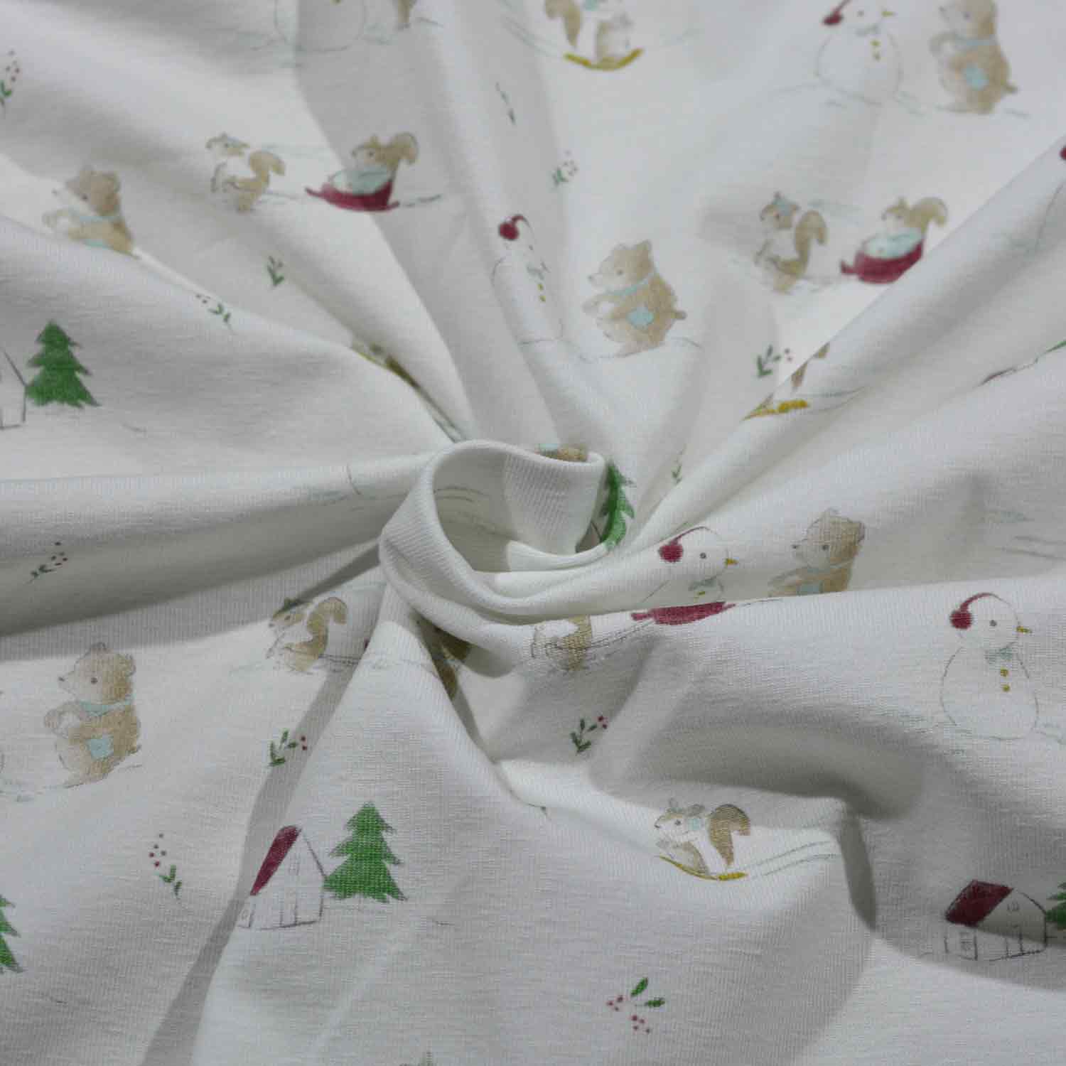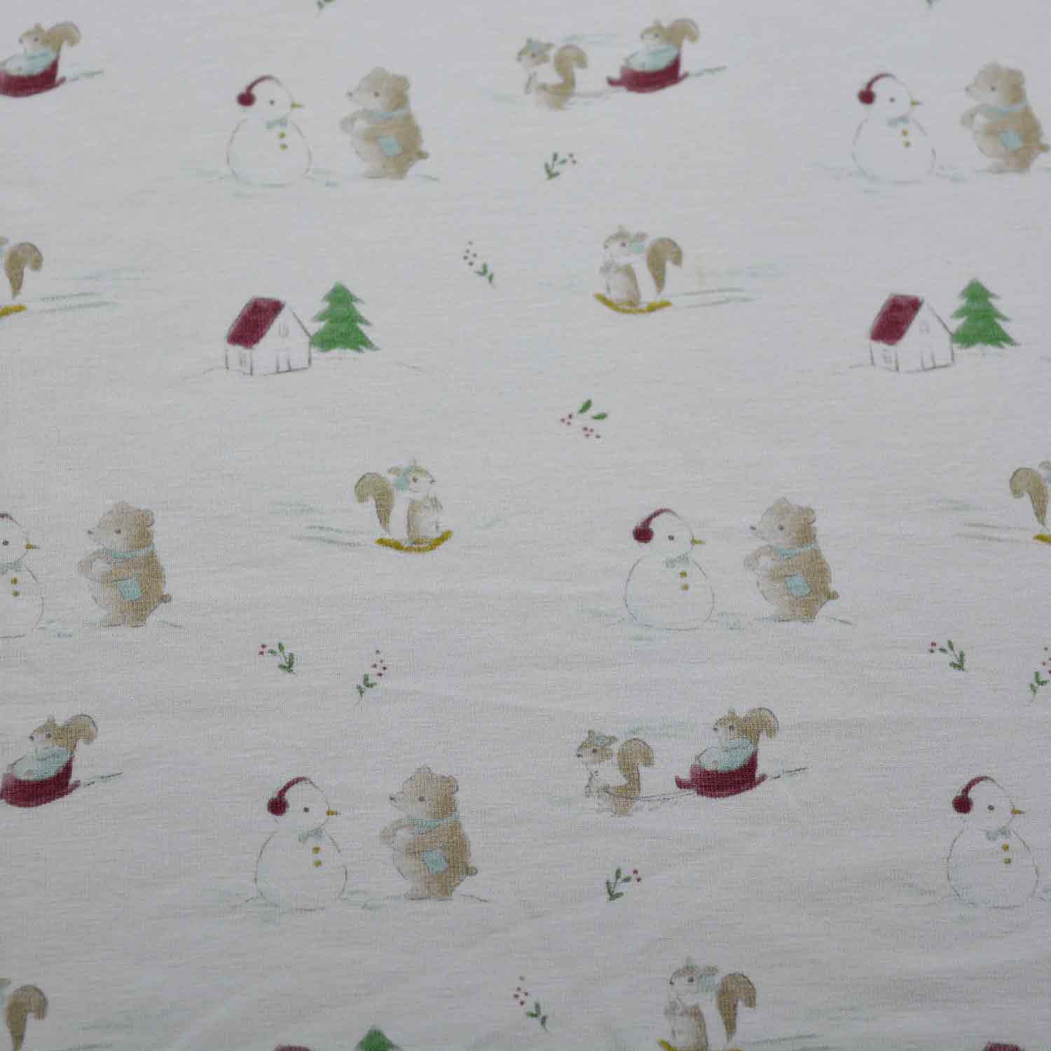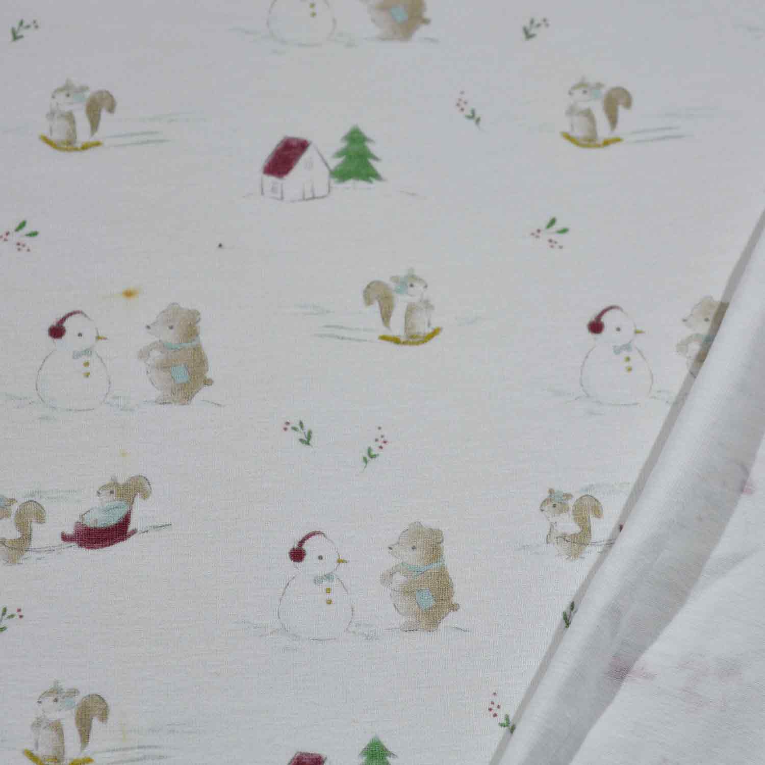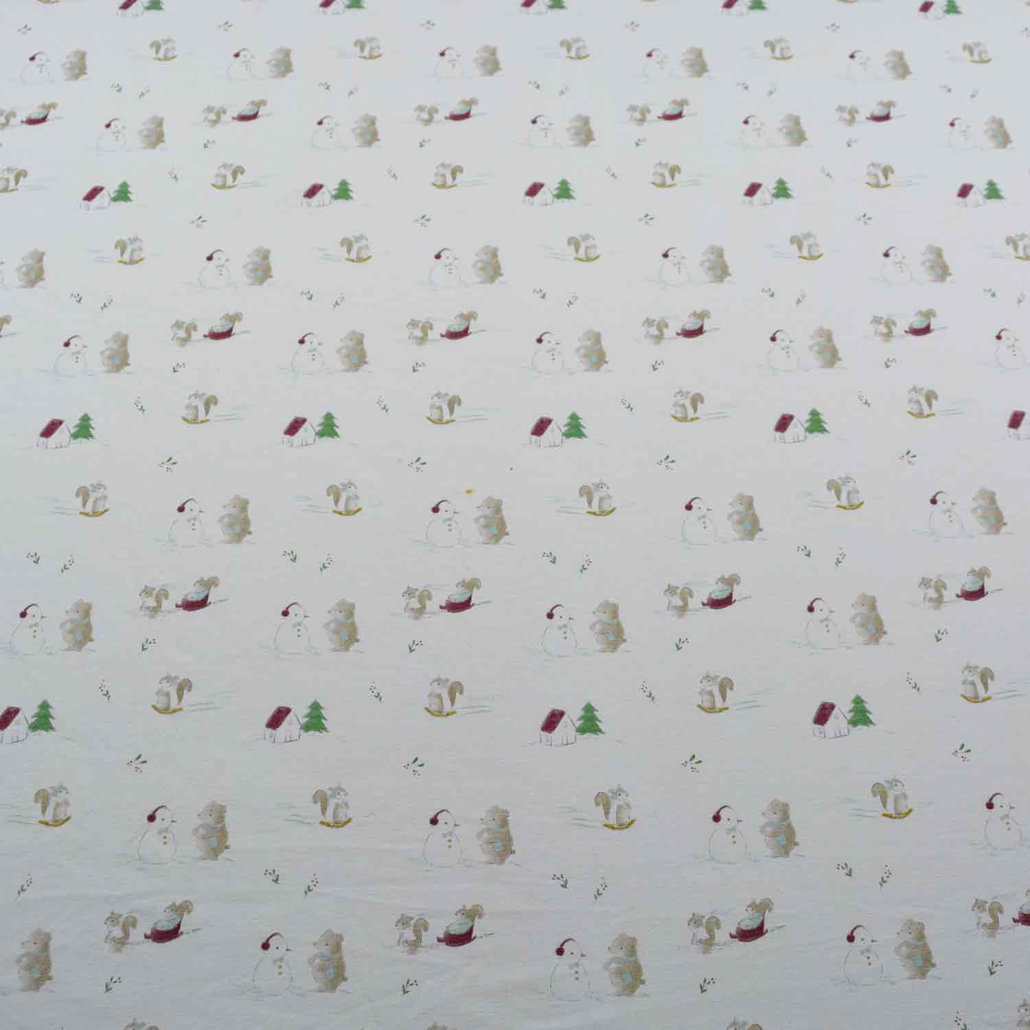 Die Oberfläche ist mit Schlitten, Schneemann, Hasen und weiteren Wintermotiven auf ecrufarbenem Untergrund bedruckt.