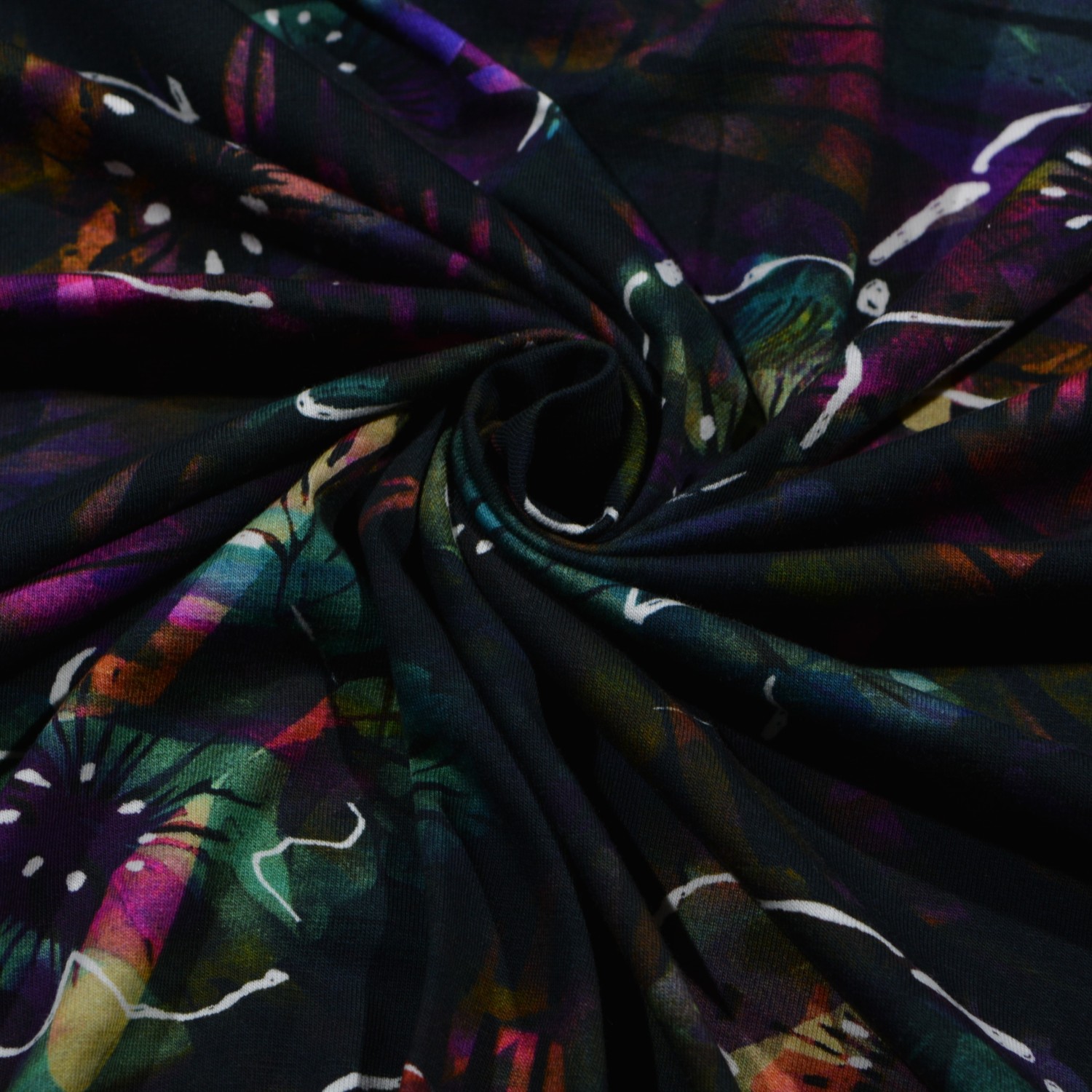 Dieser hochwertige Baumwoll-Jersey begeistert mit einem intensiven, tropischen Blumenmuster auf einem dunklen Hintergrund. Die bunten, kontrastreichen Farben wie Lila, Grün und Blau verschmelzen harmonisch und verleihen dem Stoff einen mystischen Look. Die 96% Baumwolle und 4% Elasthan sorgen für ein angenehmes Tragegefühl und eine leichte Dehnbarkeit, die perfekt für bequeme Modeprojekte wie T-Shirts, Kleider und Röcke geeignet ist. Mit einer Breite von 150 cm und einem Gewicht von 165 g/m² ist dieser Stoff ideal für detailverliebte Kreationen, die sich sowohl im Alltag als auch bei besonderen Anlässen hervorheben. Die lebhaften Blumendetails verleihen dem Design einen Hauch von Exotik und machen es zu einem perfekten Stoff für modebewusste und kreative Nähprojekte.
