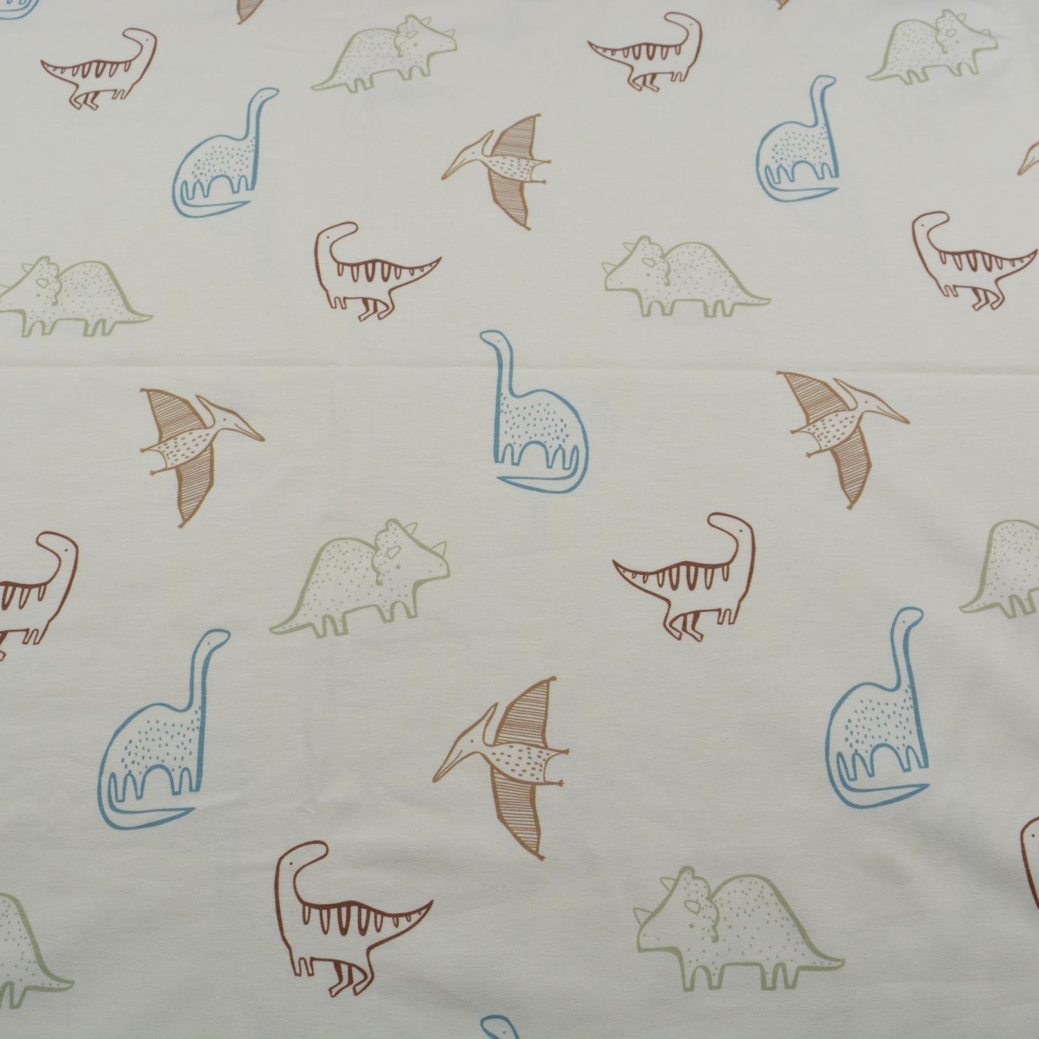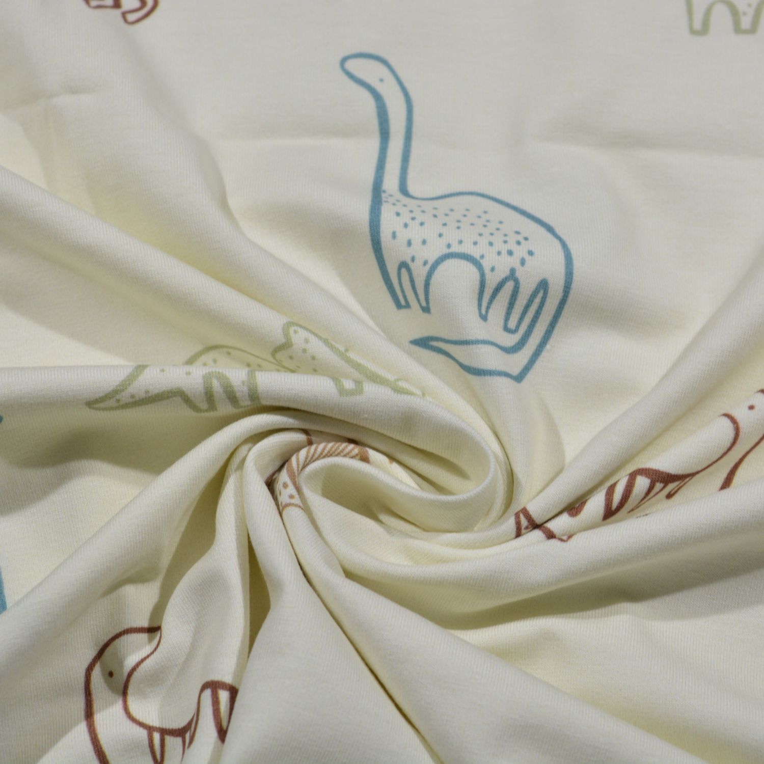 Mit einem Gewicht von ca. 200 g/m² und einer Breite von ca. 145 cm eignet sich der Stoff hervorragend für Alltagskleidung, Kinderbekleidung sowie Accessoires. Das verspielte Dino-Design macht ihn besonders beliebt für Baby- und Kindermode.