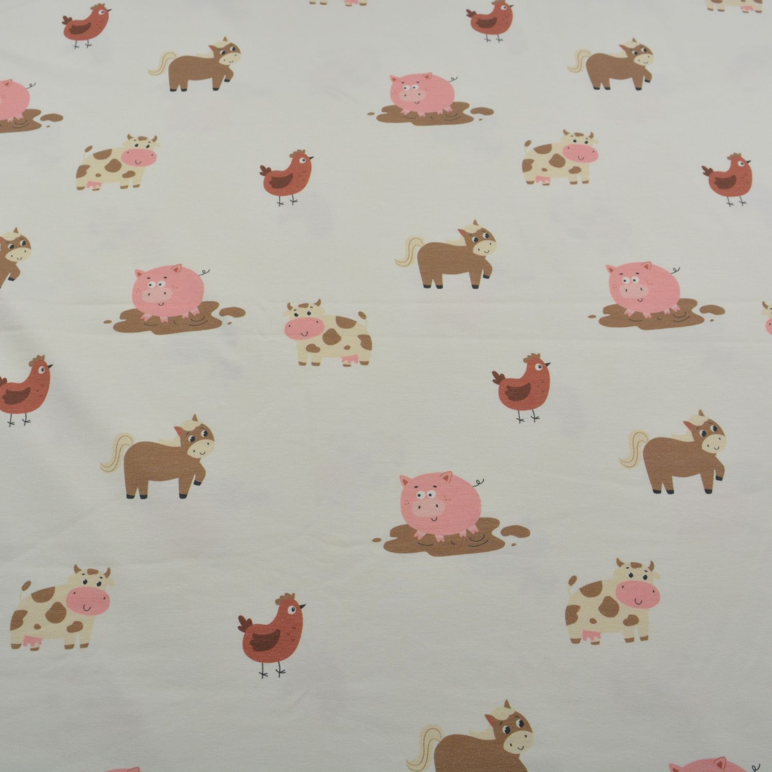 Dieser hochwertige Baumwoll-Jersey überzeugt durch seine weiche, elastische Qualität und den angenehmen Griff. Das verspielte Design mit Bauernhof-Motiven wie Kuh, Schwein, Pferd und Huhn verleiht dem Stoff eine kindgerechte und freundliche Ausstrahlung. Der Jersey ist hautsympathisch, atmungsaktiv und durch den Elasthan-Anteil besonders bequem zu tragen.