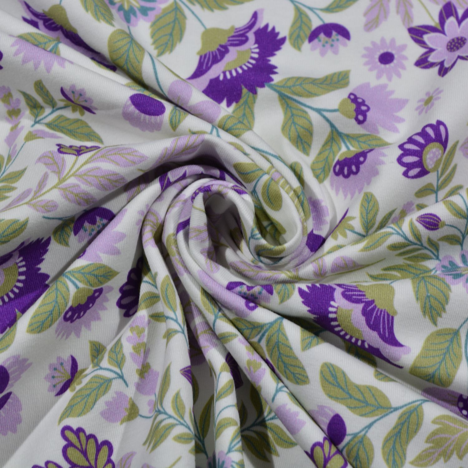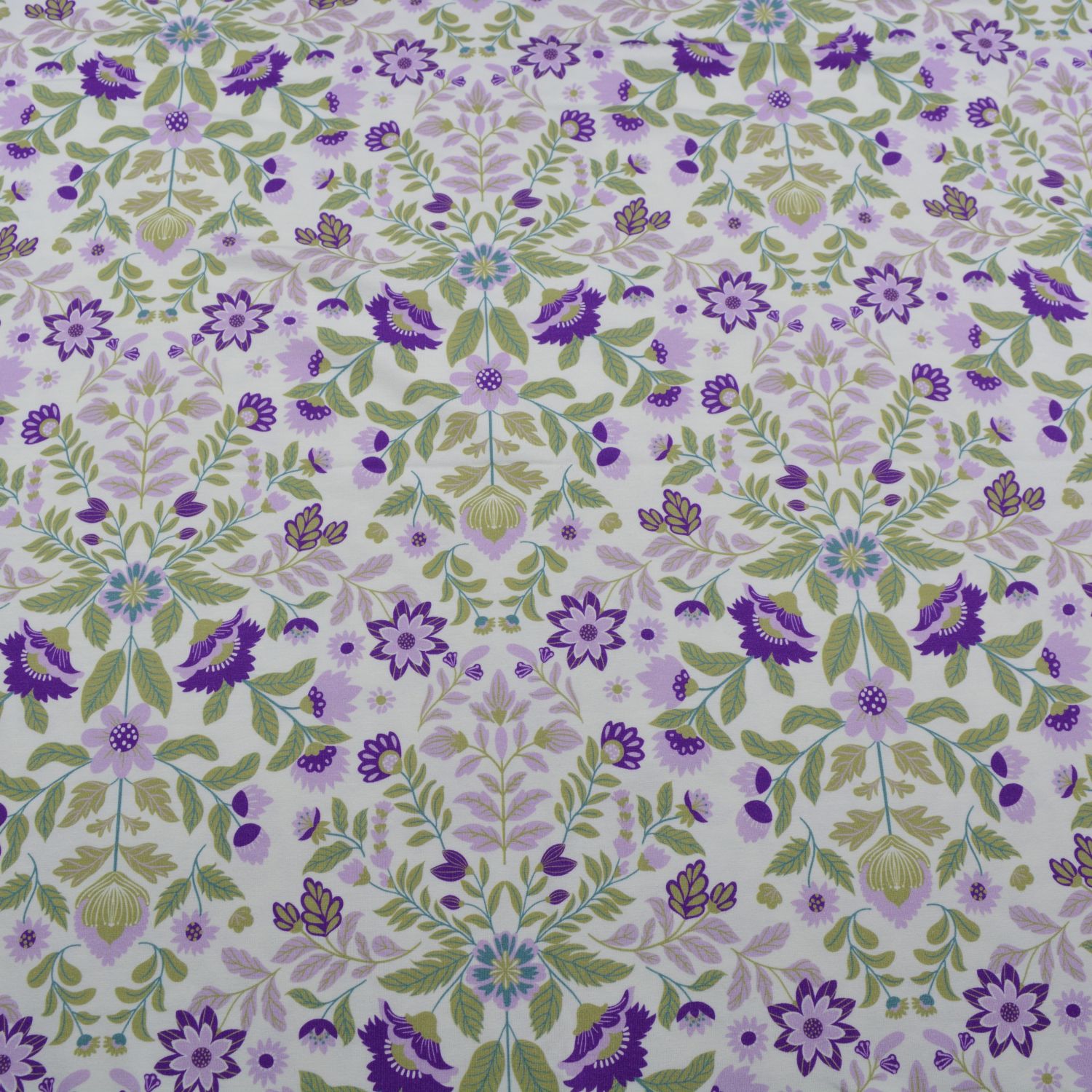 Dieser hochwertige Baumwolljersey überzeugt mit einem filigranen, symmetrischen Blumenmuster in harmonischen Lila- und Grüntönen auf hellem Hintergrund. Die detailreichen floralen Ornamente wirken elegant und gleichzeitig verspielt – perfekt für moderne und feminine Nähprojekte.
