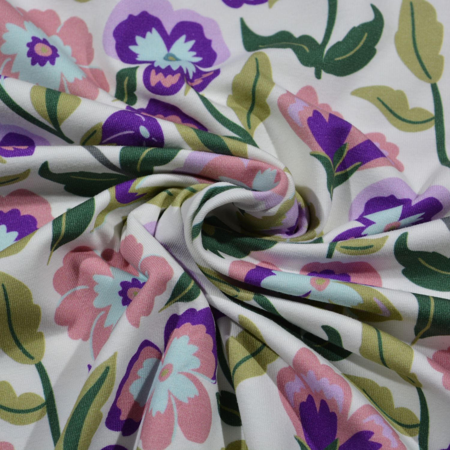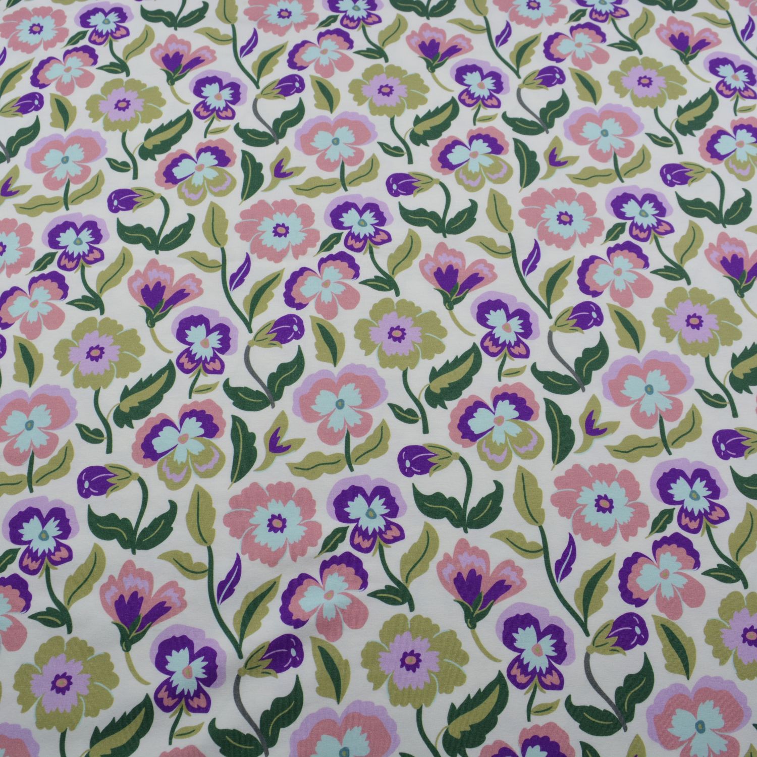 Dieser hochwertige Baumwolljersey begeistert mit einem fröhlichen, verspielten Blumenmuster in harmonischen Pastellfarben. Zarte Blüten in Rosa, Lila, Creme und Grüntönen verteilen sich gleichmäßig auf dem hellen Hintergrund und sorgen für ein lebendiges, aber dennoch ruhiges Gesamtbild.