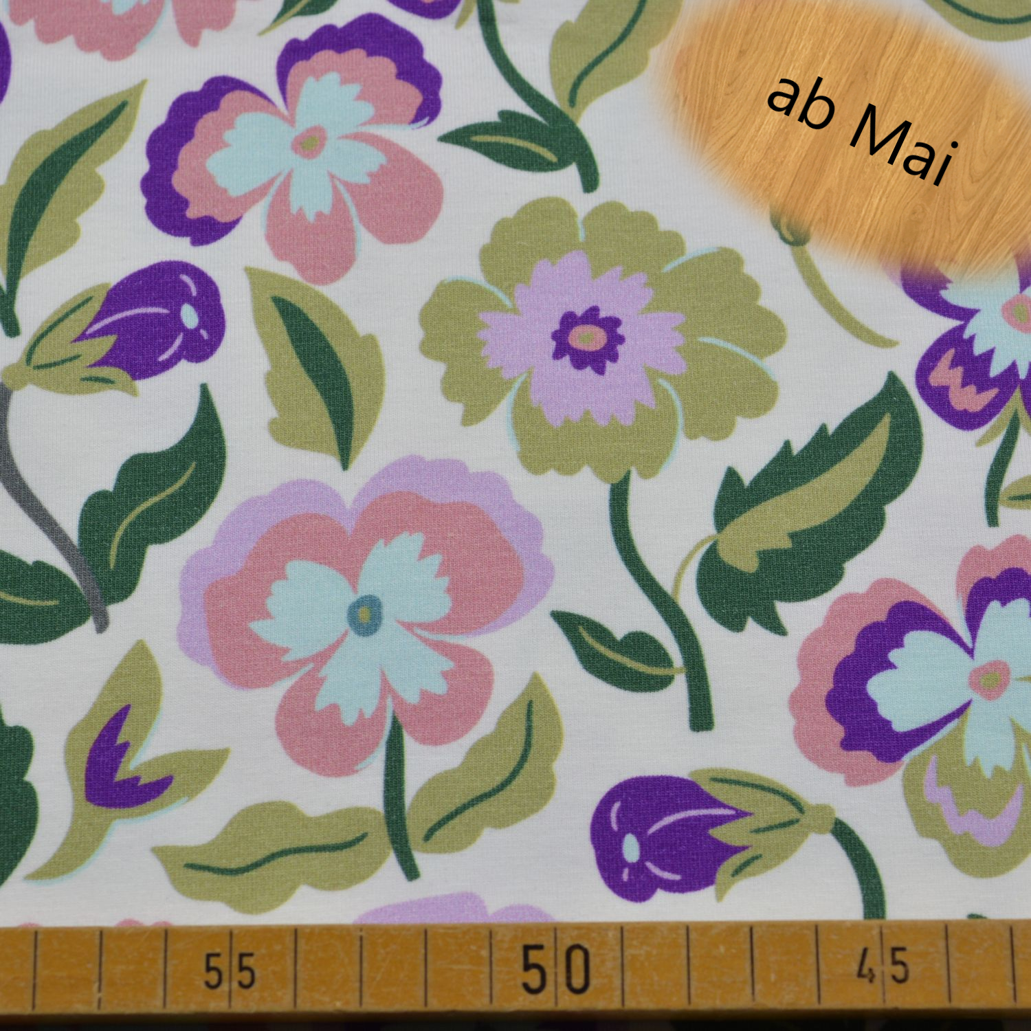 Die stilisierten Blumen und geschwungenen Blätter verleihen dem Stoff eine moderne, leicht retro-inspirierte Optik. Durch die ausgewogene Farbkomposition wirkt der Jersey freundlich und vielseitig kombinierbar – perfekt für kreative Nähideen.