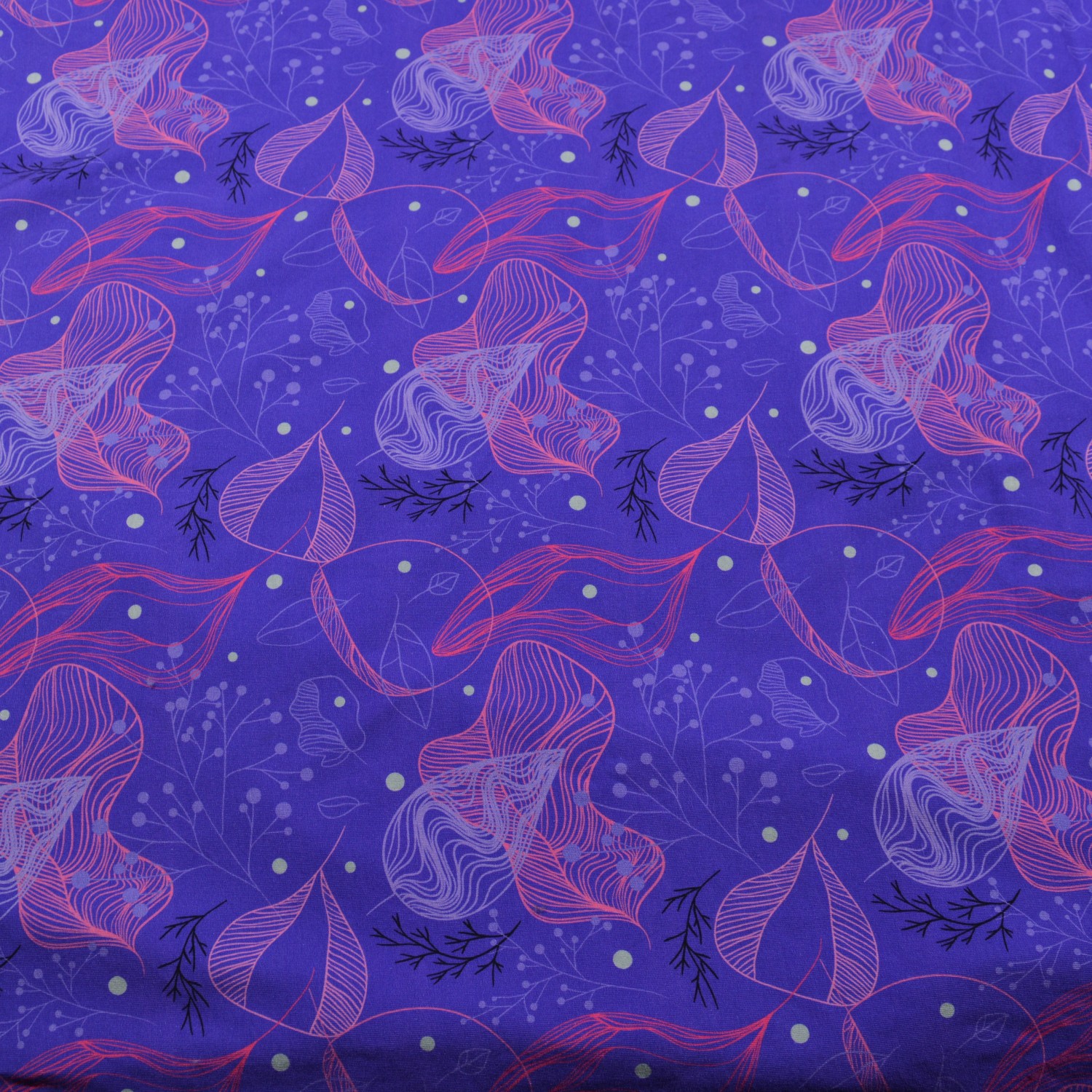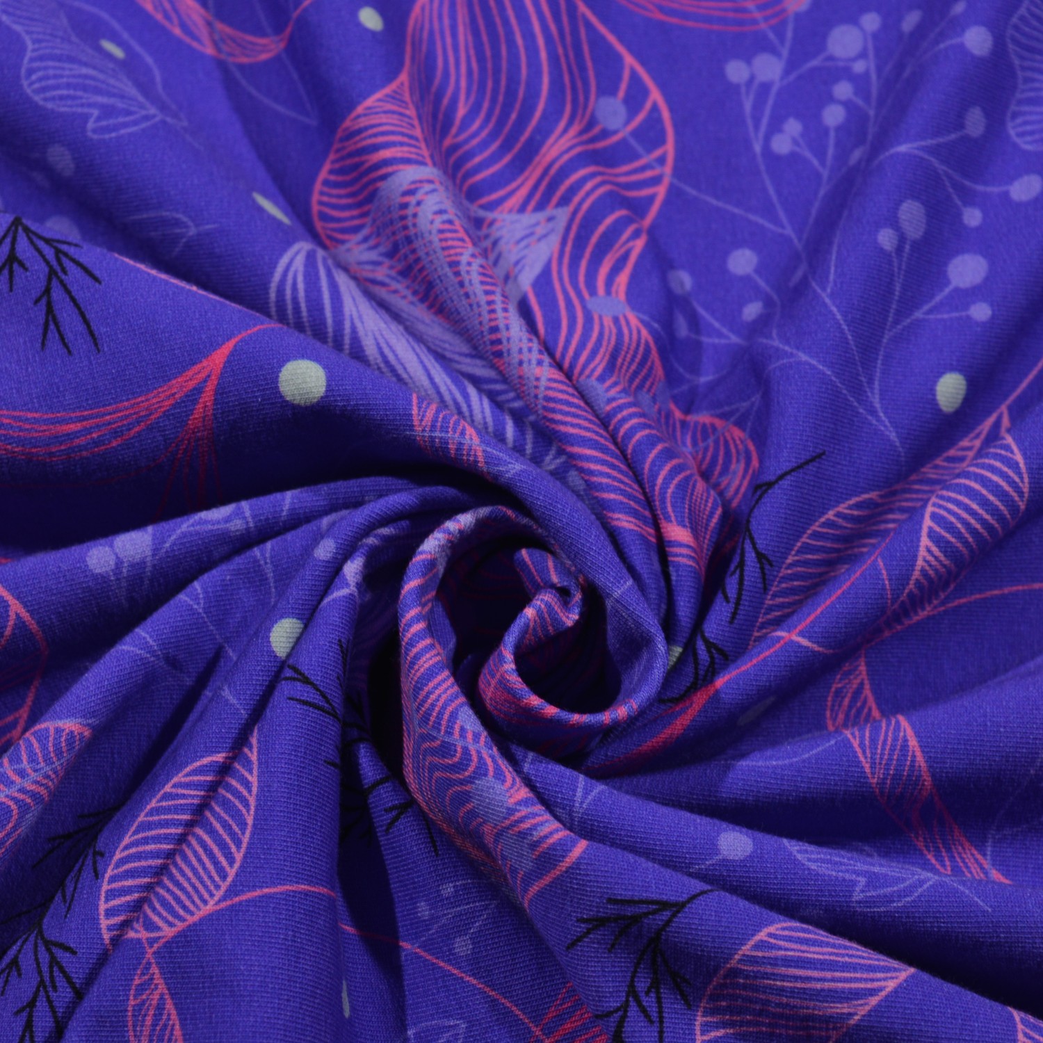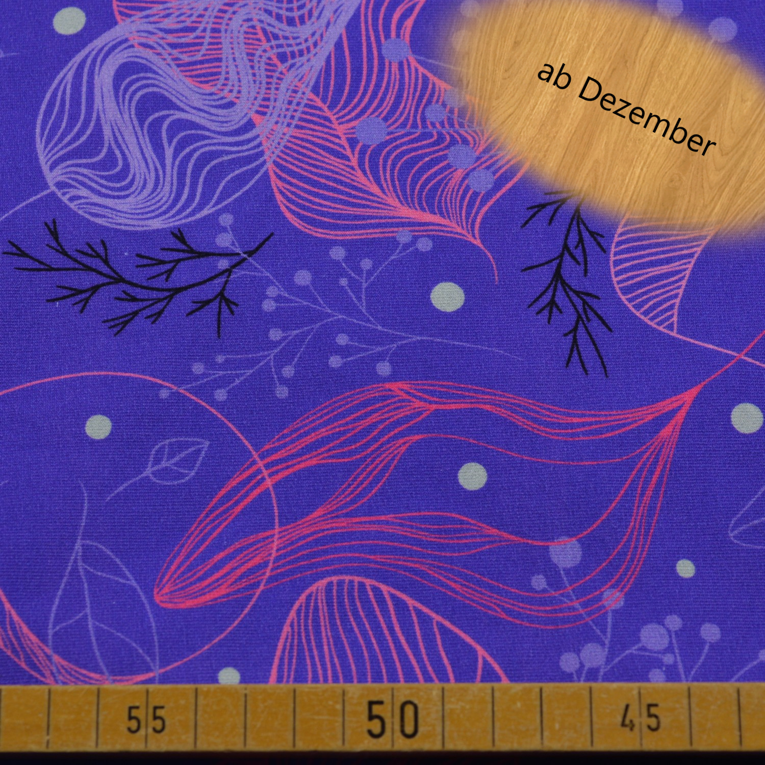 Ein stilvoller French Terry für kreative Modeprojekte: Das Design kombiniert fließende Linien und Blätterformen in Pink, Flieder und Schwarz auf intensivem Lilagrund – modern, künstlerisch und auffällig zugleich.