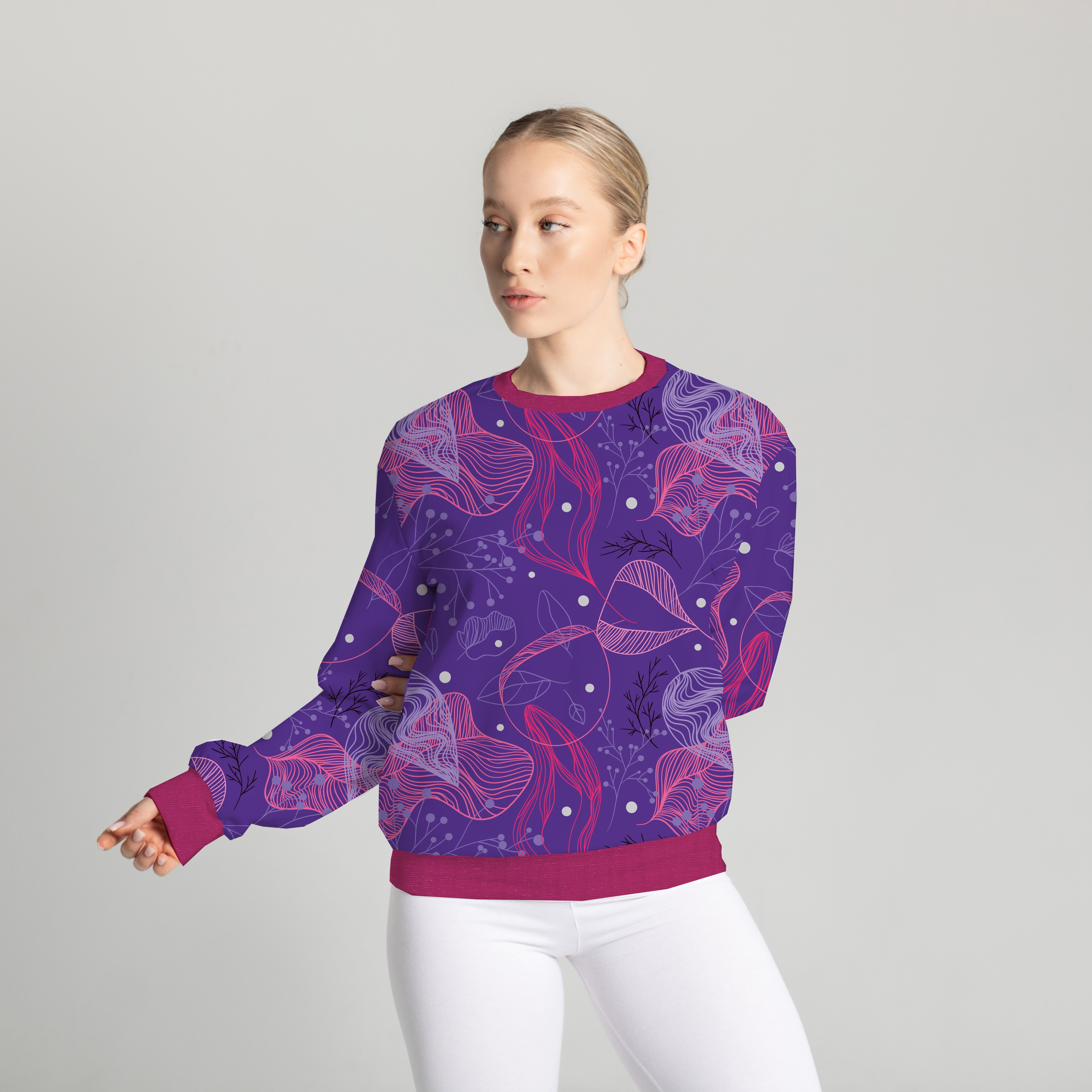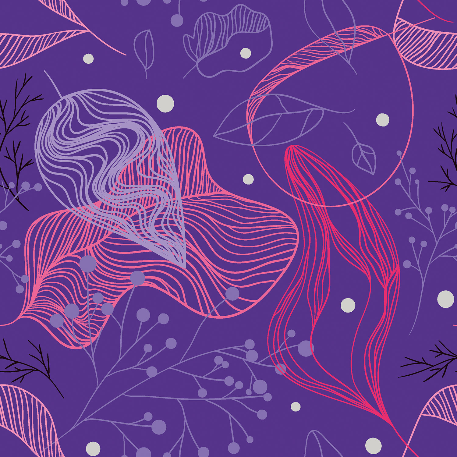 Ein stilvoller French Terry für kreative Modeprojekte: Das Design kombiniert fließende Linien und Blätterformen in Pink, Flieder und Schwarz auf intensivem Lilagrund – modern, künstlerisch und auffällig zugleich.