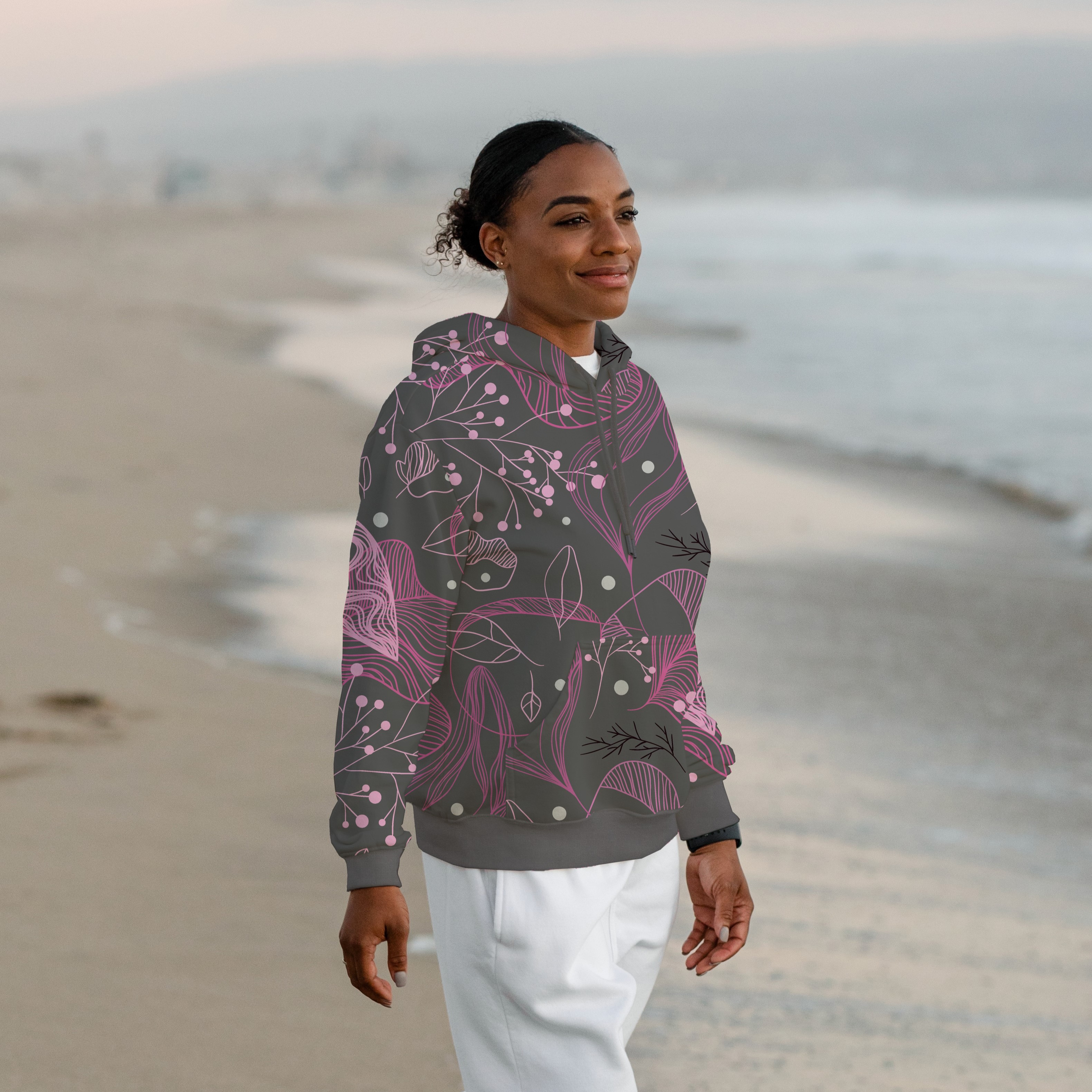 Dieser French Terry begeistert mit einem modernen, künstlerischen Blättermuster in Rosa, Pink und Schwarz auf elegantem grauen Hintergrund. Die feinen Linien und floralen Elemente verleihen dem Stoff eine stilvolle, feminine Note – perfekt für trendige Nähprojekte.