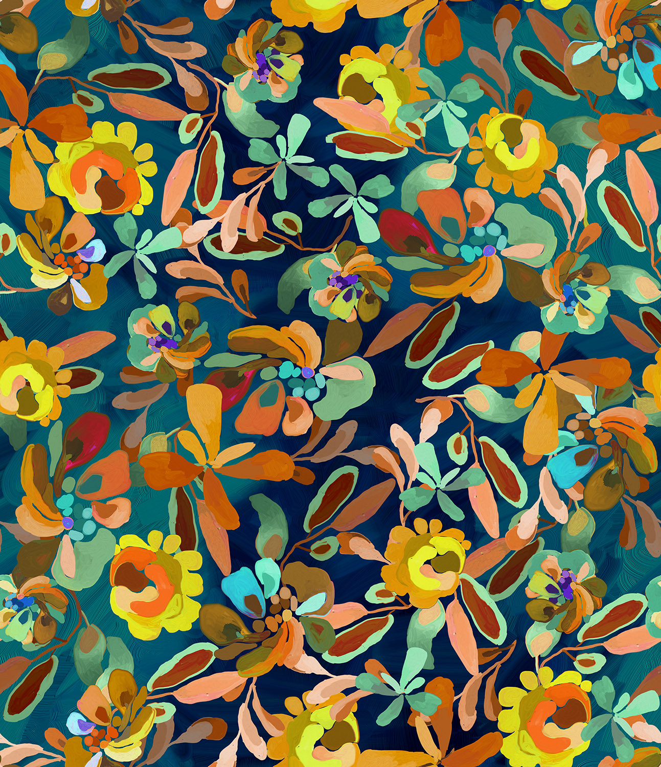 Die Oberfläche ist mit kleinen und großen Blüten auf türkisfarbenem Untergrund bedruckt.