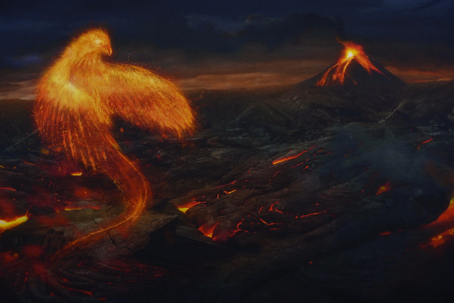 Das Design dieses Stoffes ist absolut atemberaubend und zieht sofort die Blicke auf sich. Es zeigt eine dramatische Vulkanlandschaft, in der die gewaltige Kraft der Natur in lebhaften Farben dargestellt wird. Aus dem Vulkan erhebt sich ein majestätischer Phönix, der in prächtigen, feurigen Tönen gehalten ist. Das Bild des aufsteigenden Phönix, der für Wiedergeburt und Unsterblichkeit steht, verleiht dem Stoff eine symbolische Tiefe und eine gewisse Erhabenheit. Die Farben reichen von intensiven Rottönen und leuchtendem Orange bis hin zu tiefen Schwarztönen, die die glühende Hitze und die unbändige Kraft des Vulkans widerspiegeln.