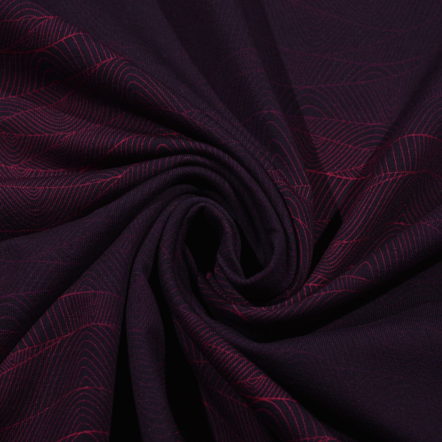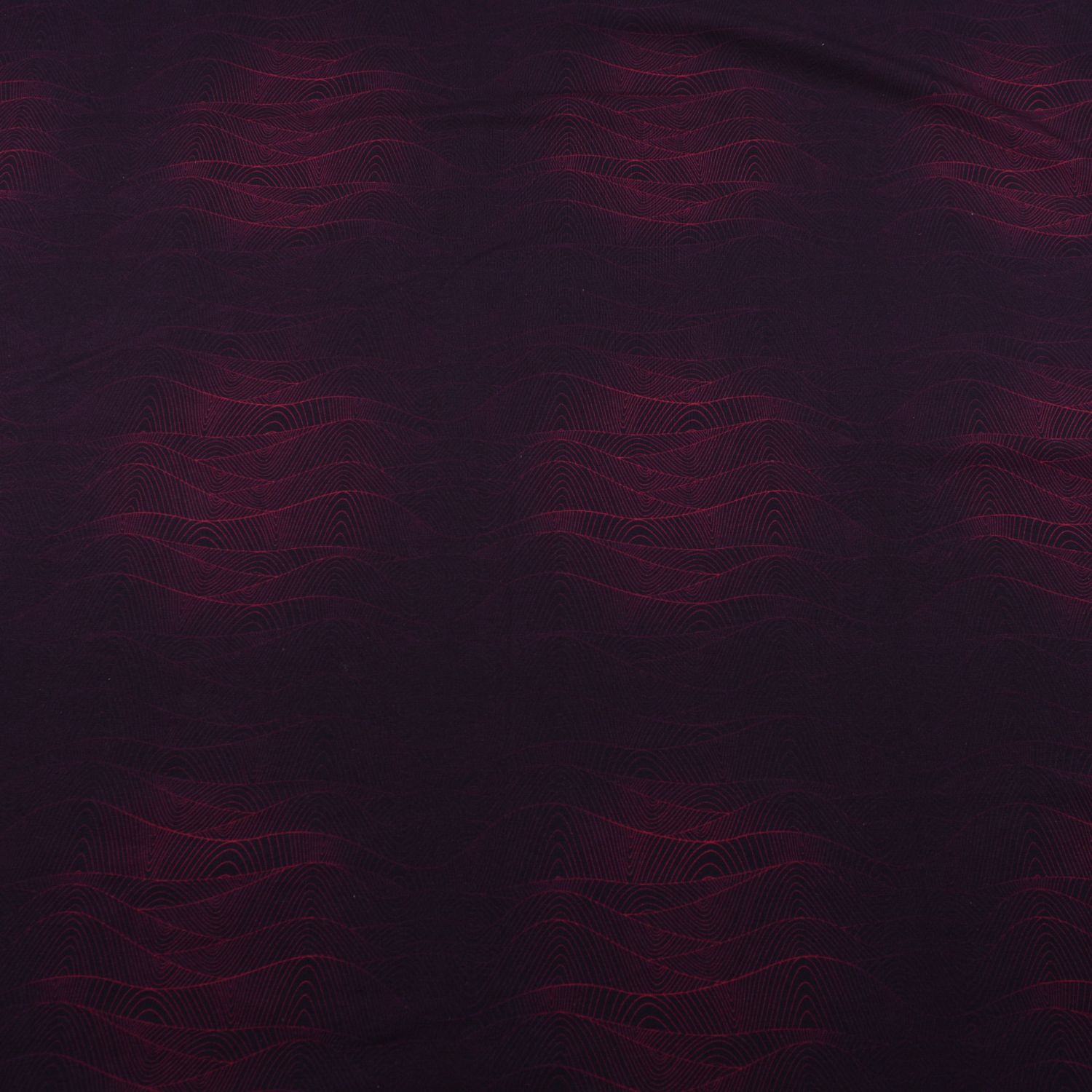 Dieser hochwertige French Terry besticht durch sein elegantes, fein gearbeitetes Linienmuster in edlem Bordeaux auf dunklem Hintergrund. Die geschwungenen, wellenartigen Linien verleihen dem Stoff eine moderne, fast grafische Optik und machen ihn zu einem stilvollen Begleiter für viele Nähprojekte.