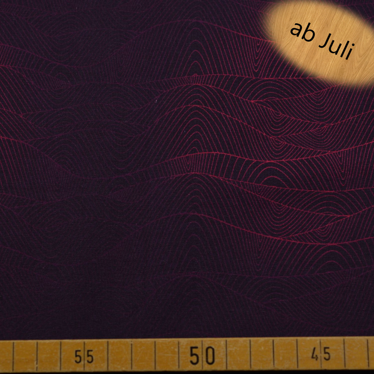 Dieser hochwertige French Terry besticht durch sein elegantes, fein gearbeitetes Linienmuster in edlem Bordeaux auf dunklem Hintergrund. Die geschwungenen, wellenartigen Linien verleihen dem Stoff eine moderne, fast grafische Optik und machen ihn zu einem stilvollen Begleiter für viele Nähprojekte.