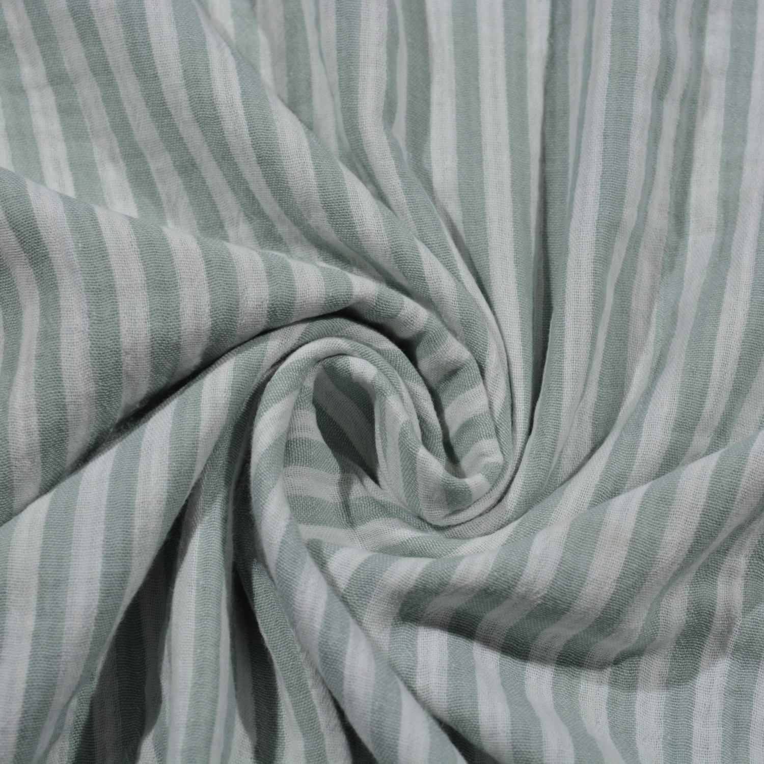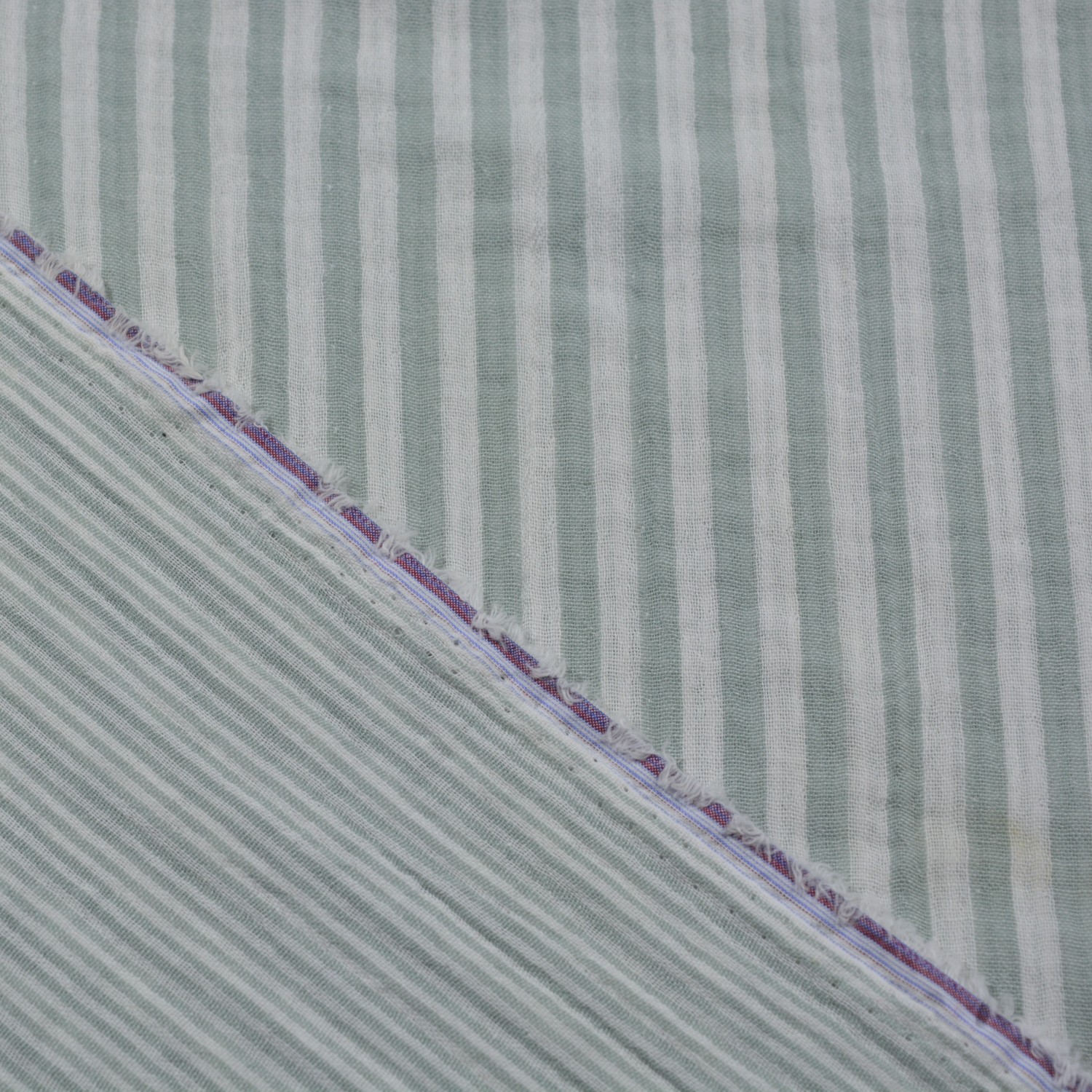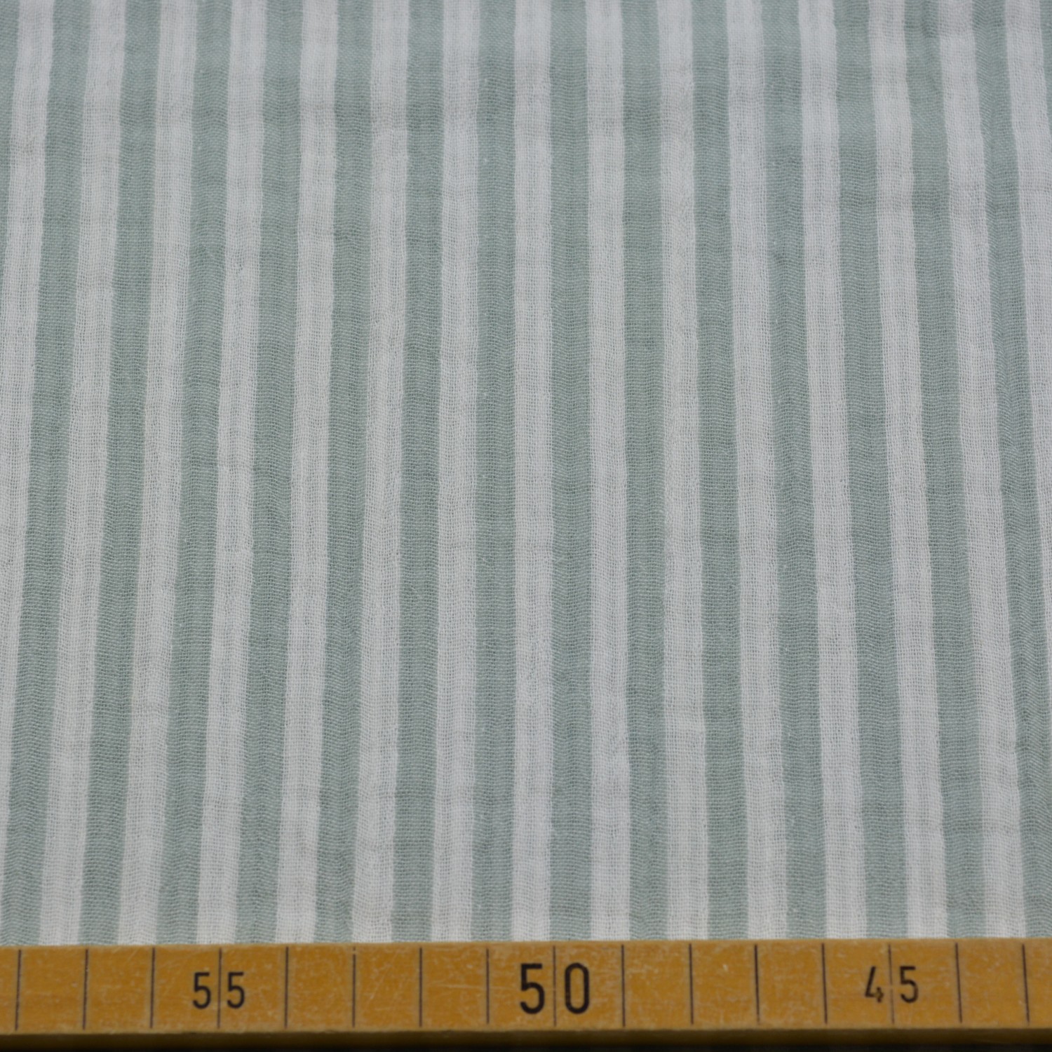 Dieser feine Musselin Doubleface aus 100% Baumwolle überzeugt durch sein elegantes Streifenmuster in Mint und Offwhite. Durch die garngefärbte Webung besitzt der Stoff zwei unterschiedliche Seiten mit variierenden Streifenbreiten, wodurch sich vielseitige Gestaltungsmöglichkeiten ergeben. Der weiche, luftige Stoff ist perfekt für Blusen, Sommerkleidung, Tücher, Babyartikel oder Heimtextilien geeignet.