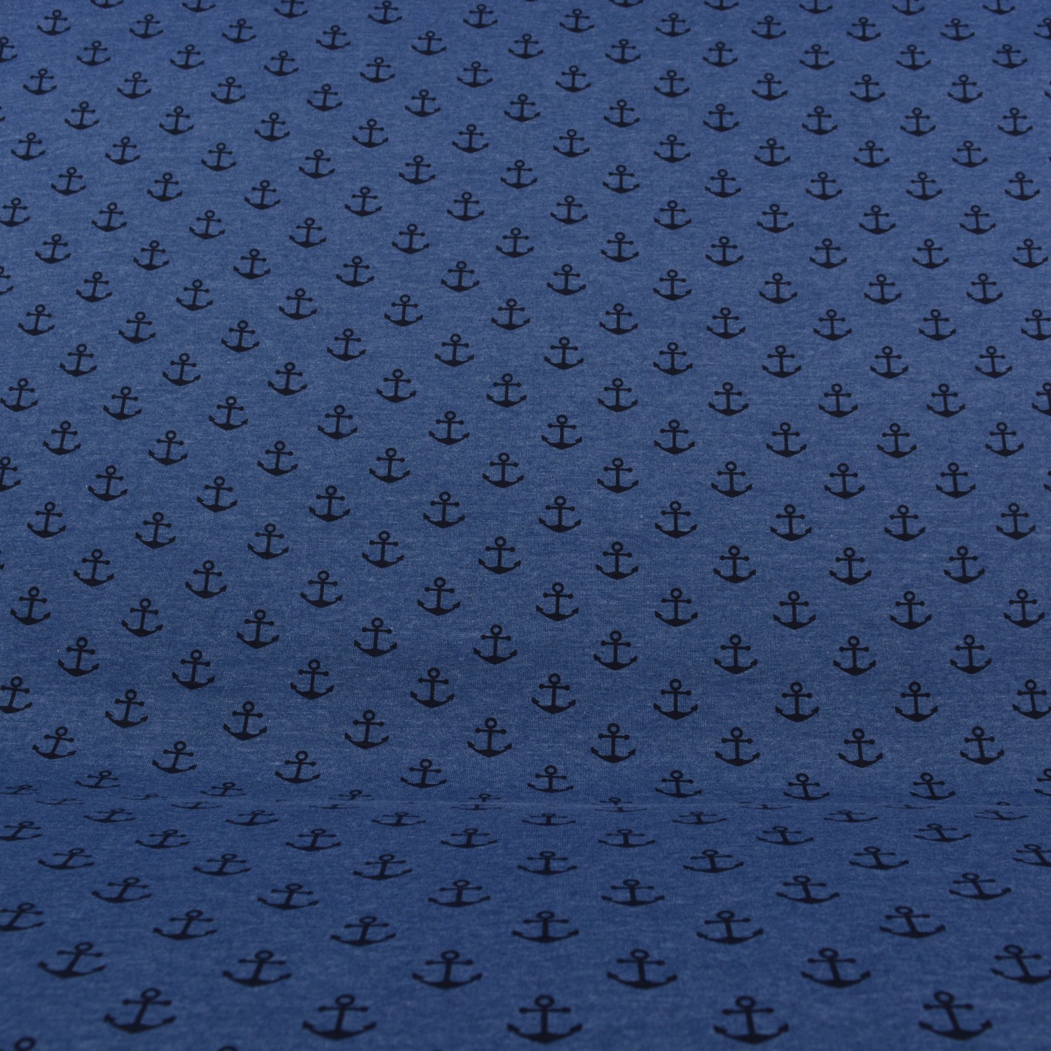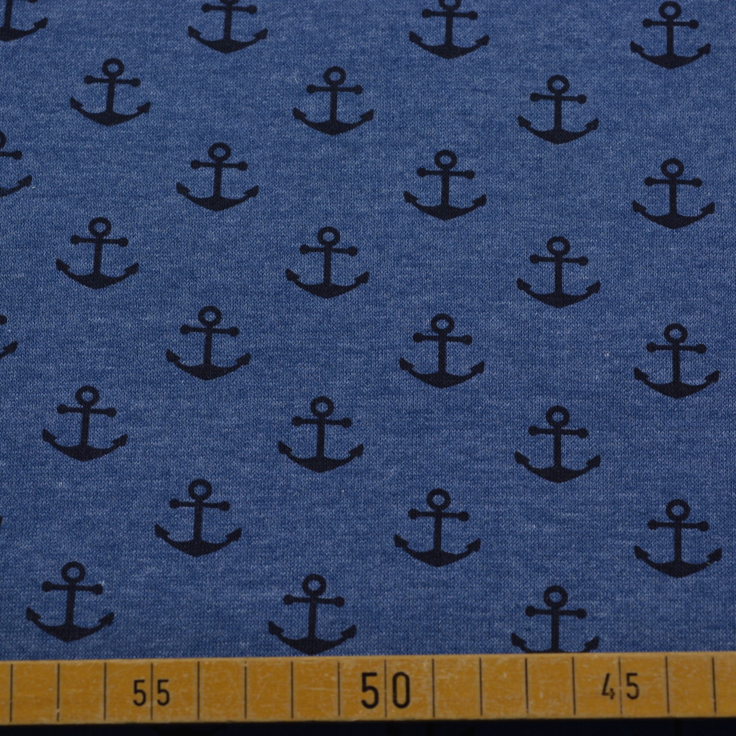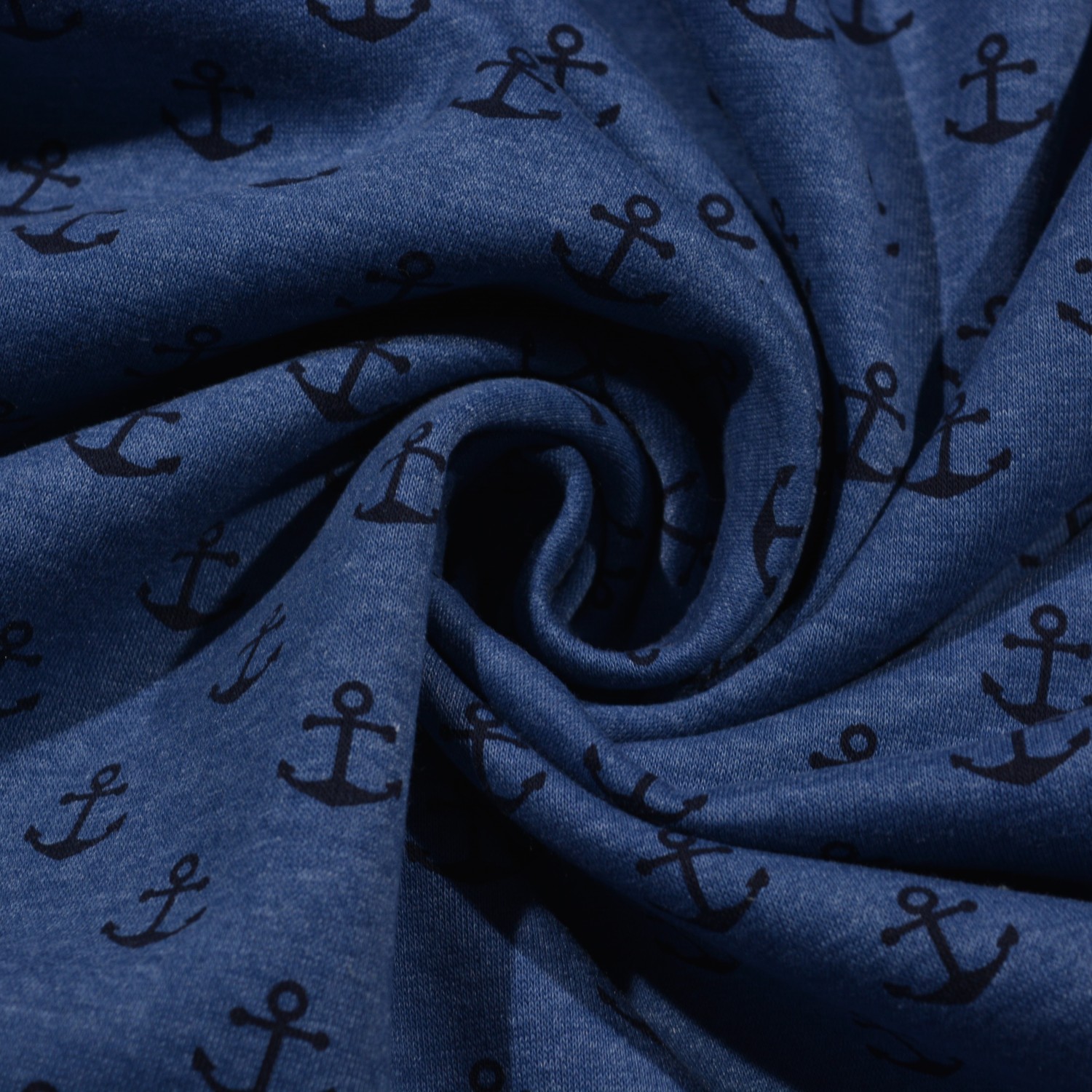 Ein klassisches maritimes Design trifft auf kuschelweichen Tragekomfort! Dieser Sweatstoff mit feinem Anker-Motiv in Jeansblau ist ideal für maritime Modeprojekte, Kinderkleidung oder lässige Freizeitlooks.