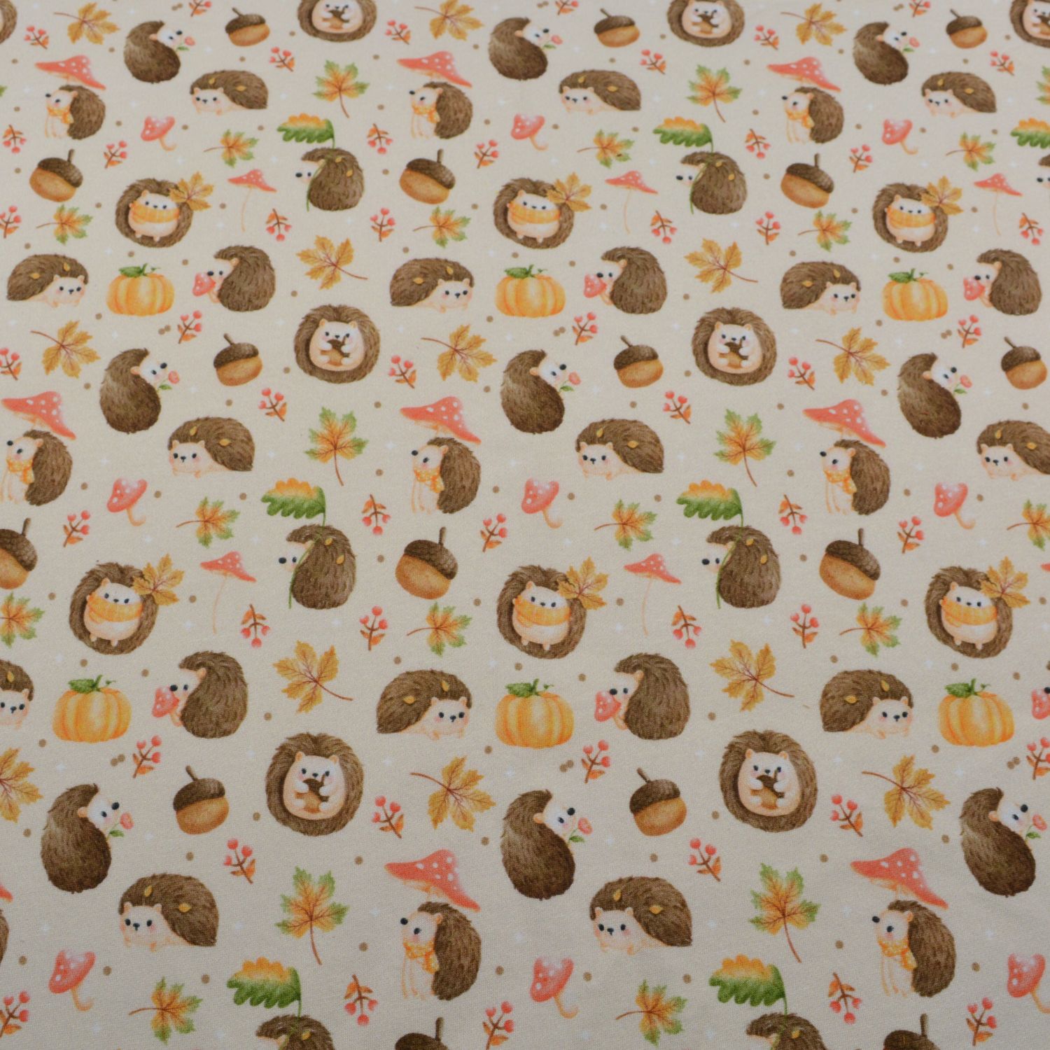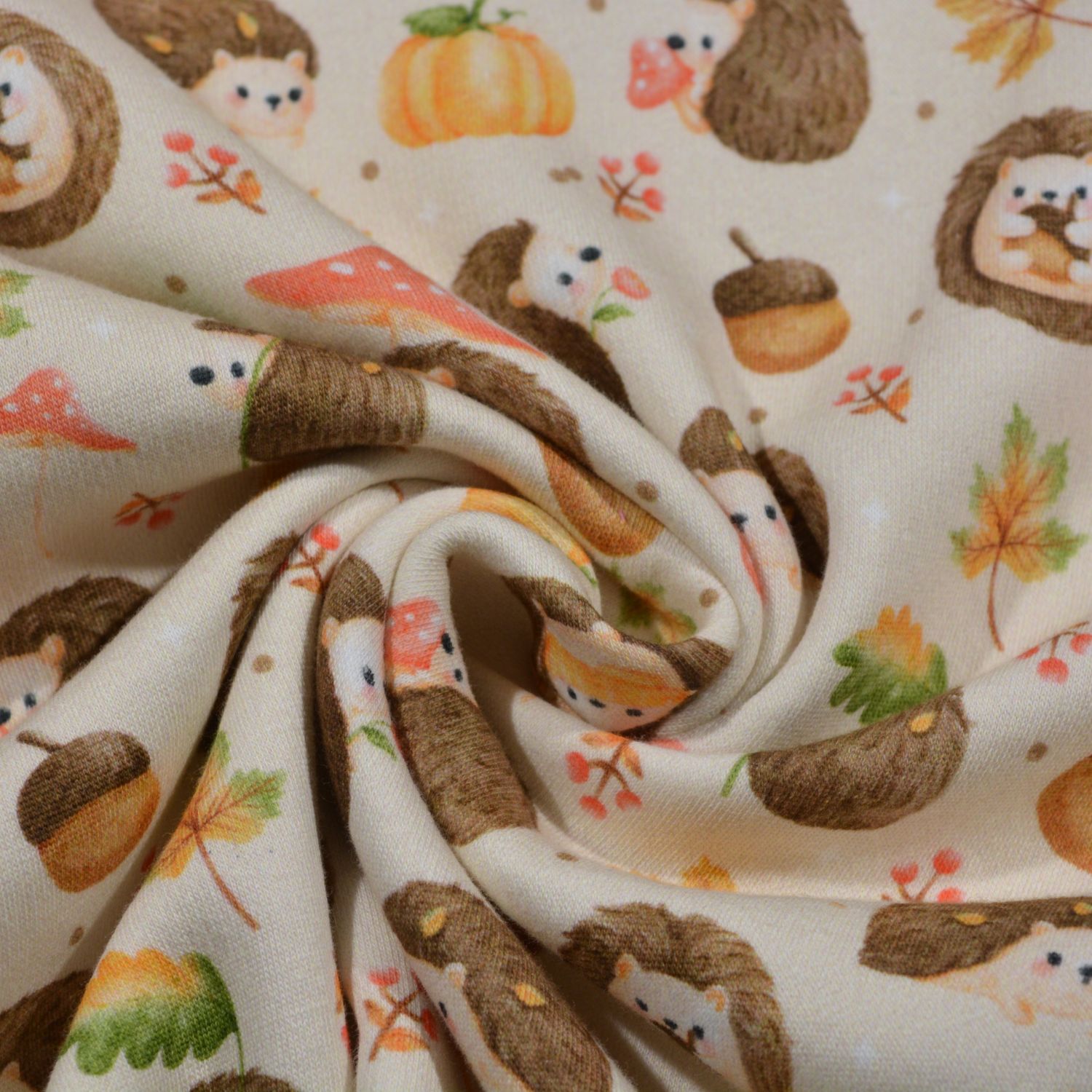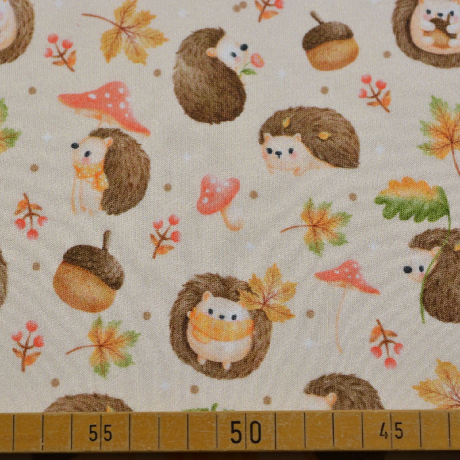 Sweatstoff „Herbst Igel“ – Verspieltes Waldmotiv auf Beige