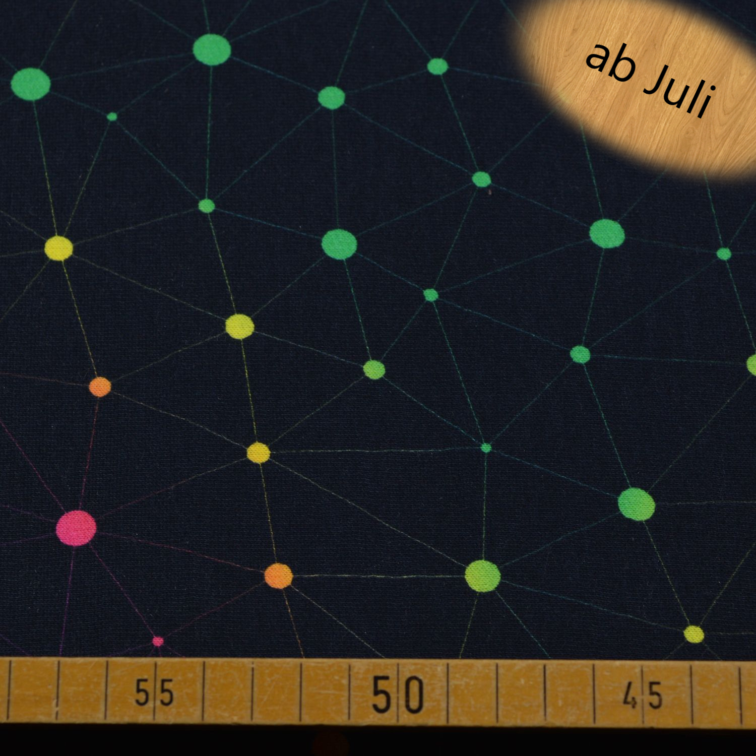 Dieser moderne Sweatstoff überzeugt mit einem auffälligen, grafischen Netzwerk-Design auf tiefschwarzem Hintergrund. Feine Linien verbinden leuchtende Punkte in Neonfarben wie Grün, Gelb, Orange, Pink und Blau und erzeugen eine dynamische, fast digitale Optik. Das Muster erinnert an Netzwerke, Verbindungen oder Sternbilder und verleiht dem Stoff einen zeitgemäßen, urbanen Look.