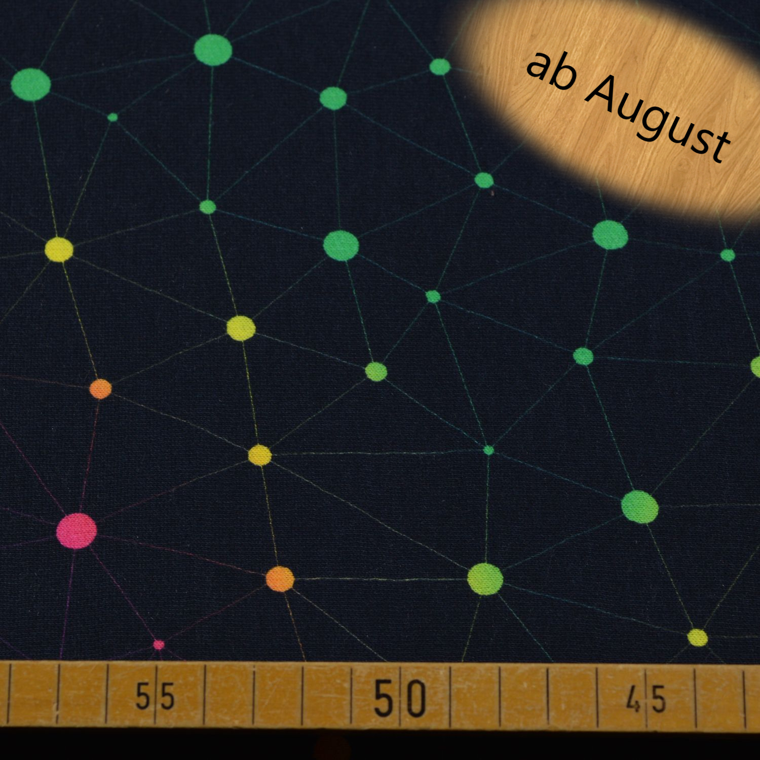 Dieser moderne Sweatstoff überzeugt mit einem auffälligen, grafischen Netzwerk-Design auf tiefschwarzem Hintergrund. Feine Linien verbinden leuchtende Punkte in Neonfarben wie Grün, Gelb, Orange, Pink und Blau und erzeugen eine dynamische, fast digitale Optik. Das Muster erinnert an Netzwerke, Verbindungen oder Sternbilder und verleiht dem Stoff einen zeitgemäßen, urbanen Look.