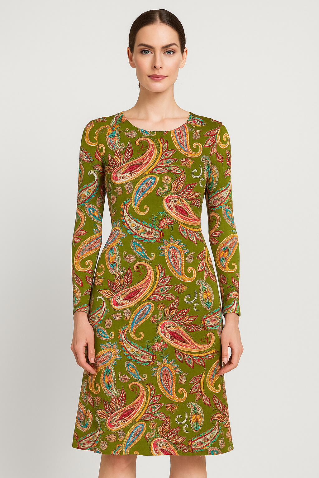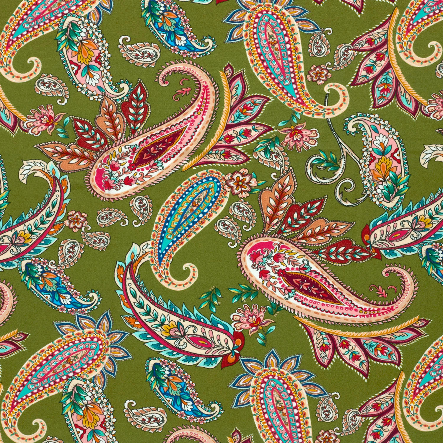 Dieser hochwertige Viskose Jersey begeistert mit einem farbenfrohen Paisley-Muster in kräftigen Blau-, Rot- und Orangetönen auf grünem Hintergrund. Der Stoff fällt weich, ist angenehm elastisch und sorgt für besten Tragekomfort. Ideal geeignet für Kleider, Shirts, Tuniken, Röcke und vieles mehr.